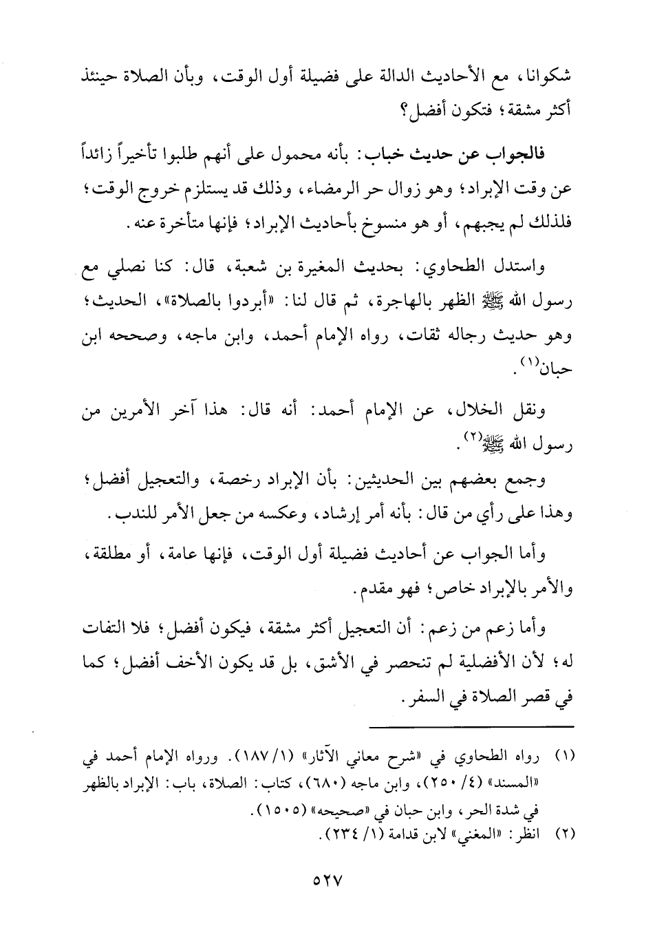 شكوانا، مع الأحاديث الدالة على فضيلة أول الوقت، وبأن الصلاة حينئذ أكثر مشقة؛ فتكون أفضل؟
