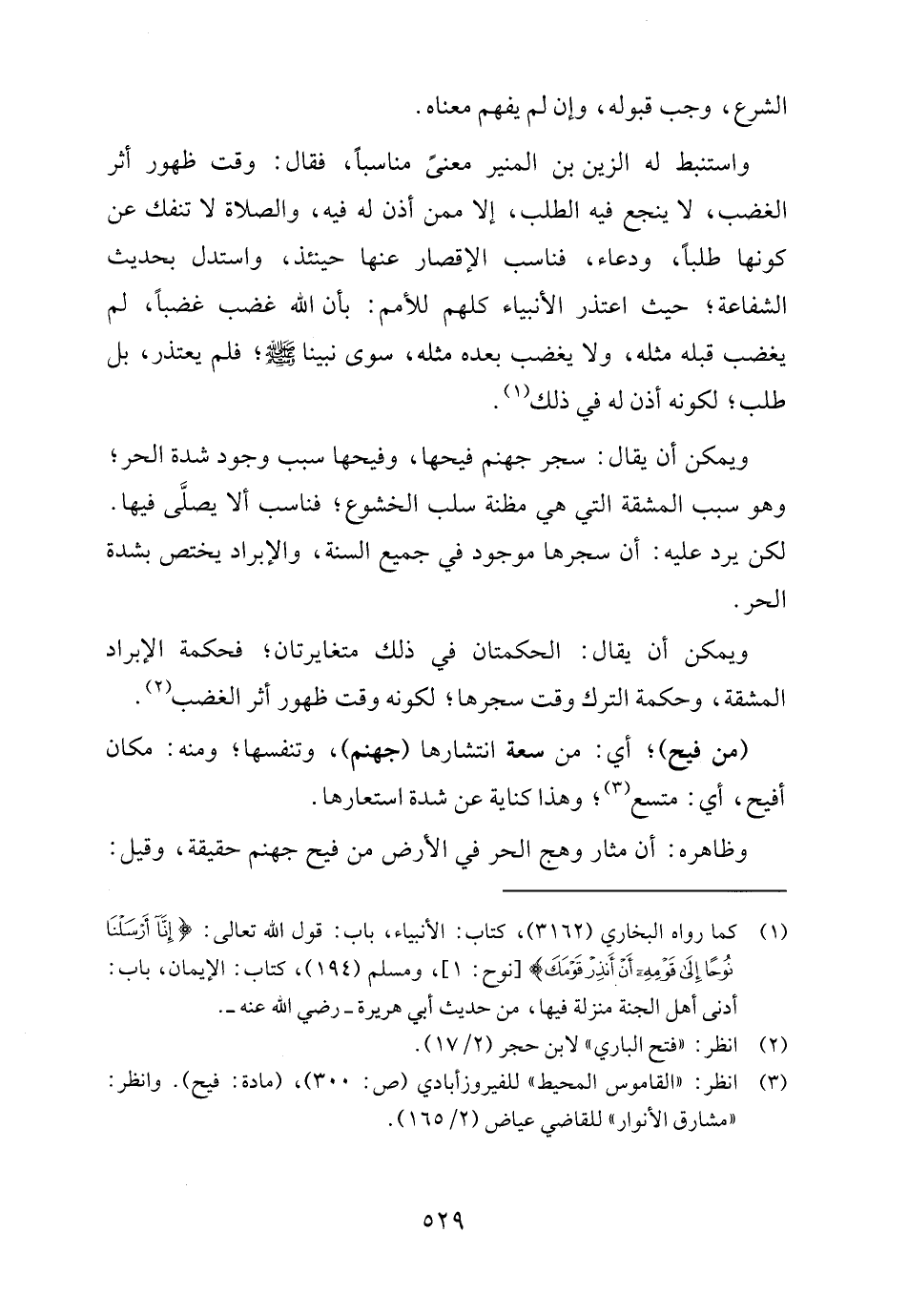 واستنبط له الزين بن المنير معنًى مناسبًا، فقال: وقت ظهور أثر الغضب، لا ينجع فيه الطلب، إلا ممن أذن له فيه، والصلاة لا تنفك عن كونها طلبًا، ودعاء، فناسب الإقصار عنها حينئذ، واستدل بحديث الشفاعة؛ حيث اعتذر الأنبياء كلهم للأمم: بأن اللَّه غضب غضبًا، لم يغضب قبله مثله، ولا يغضب بعده مثله، سوى نبينا -صلى اللَّه عليه وسلم-؛ فلم يعتذر، بل طلب؛ لكونه أذن له في ذلك (١).