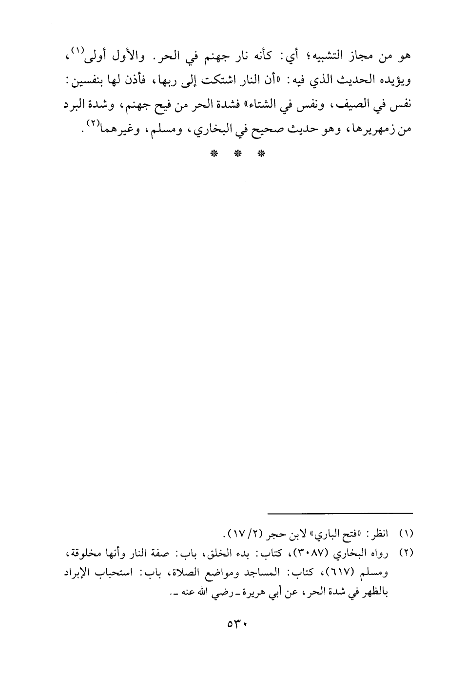(٢) رواه البخاري (٣٠٨٧)، كتاب: بدء الخلق، باب: صفة النار وأنها مخلوقة، ومسلم (٦١٧)، كتاب: المساجد ومواضع الصلاة، باب: استحباب الإبراد بالظهر في شدة الحر، عن أبي هريرة -رضي اللَّه عنه-.