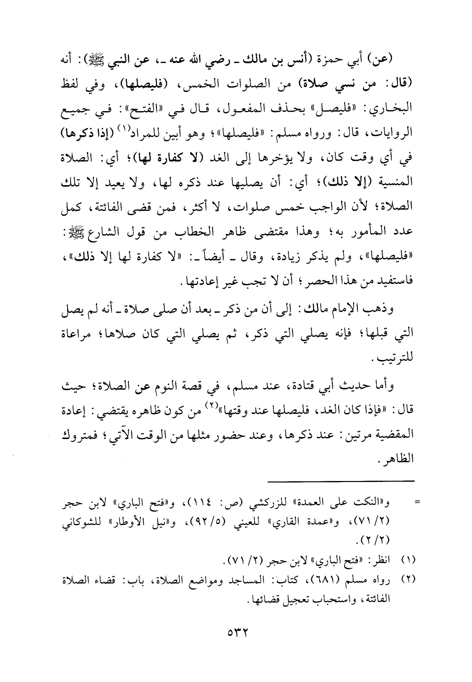 (عن) أبي حمزة (أنس بن مالك -رضي اللَّه عنه-، عن النبي -صلى اللَّه عليه وسلم-): أنه (قال: من نسي صلاة) من الصلوات الخمس، (فليصلها)، وفي لفظ البخاري: "فليصل" بحذف المفعول، قال في "الفتح": في جميع الروايات، قال: ورواه مسلم: "فليصلها"؛ وهو أبين للمراد (١) (إذا ذكرها) في أي وقت كان، ولا يؤخرها إلى الغد (لا كفارة لها)؛ أي: الصلاة المنسية (إلا ذلك)؛ أي: أن يصليها عند ذكره لها، ولا يعيد إلا تلك الصلاة؛ لأن الواجب خمس صلوات، لا أكثر، فمن قضى الفائتة، كمل عدد المأمور به؛ وهذا مقتضى ظاهر الخطاب من قول الشارع -صلى اللَّه عليه وسلم-: "فليصلها"، ولم يذكر زيادة، وقال -أيضًا-: "لا كفارة لها إلا ذلك"، فاستفيد من هذا الحصر؛ أن لا تجب غير إعادتها.