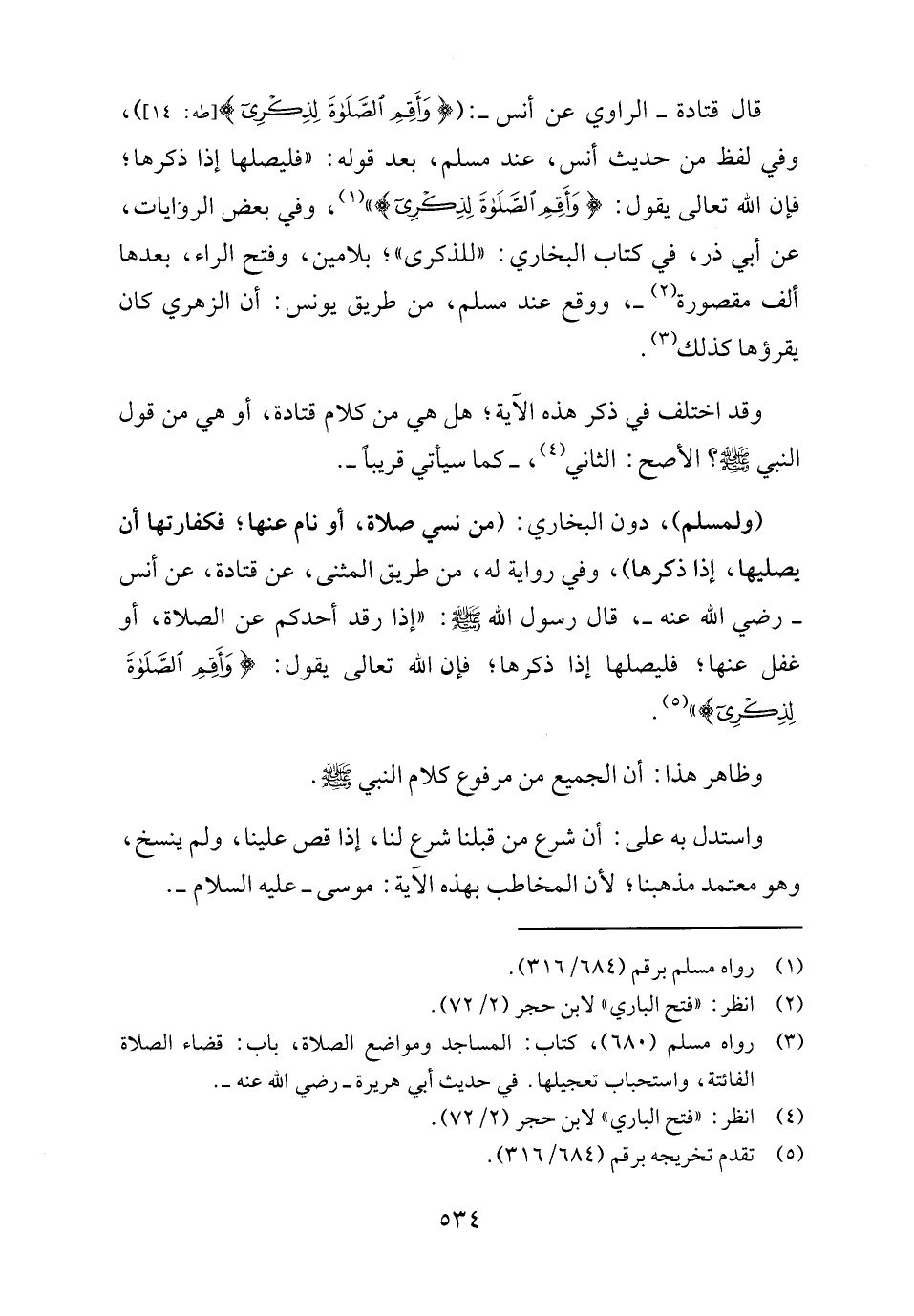 قال قتادة -الراوي عن أنس-: {وَأَقِمِ الصَّلَاةَ لِذِكْرِي} [طه: ١٤])، وفي لفظ من حديث أنس، عند مسلم، بعد قوله: "فليصلها إذا ذكرها؛ فإن اللَّه تعالى يقول: {وَأَقِمِ الصَّلَاةَ لِذِكْرِي} " (١) , وفي بعض الروايات، عن أبي ذر، في كتاب البخاري: "للذكرى"؛ بلامين، وفتح الراء، بعدها ألف مقصورة (٢) -، ووقع عند مسلم، من طريق يونس: أن الزهري كان يقرؤها كذلك (٣).