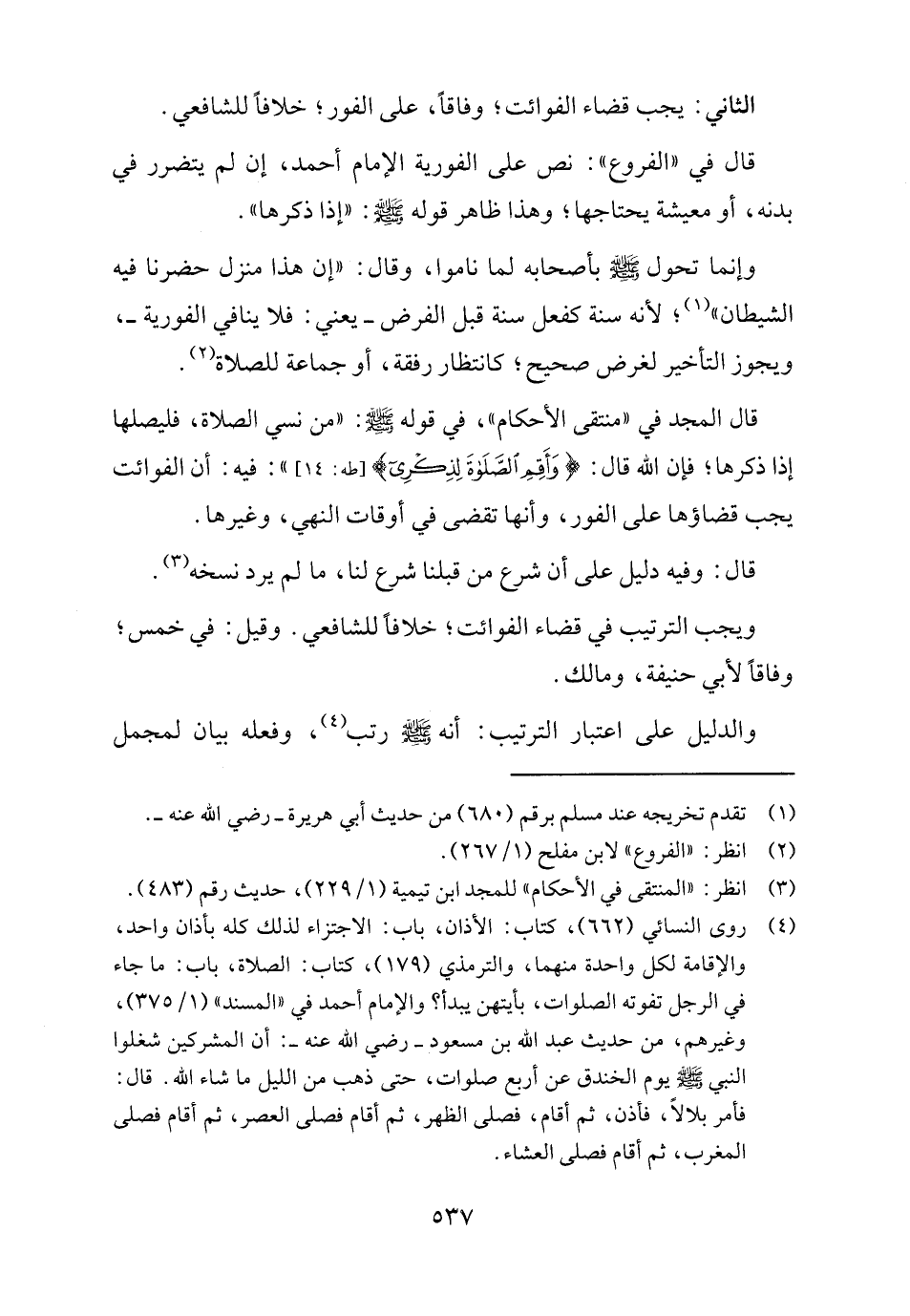 قال المجد في "منتقى الأحكام"، في قوله -صلى اللَّه عليه وسلم-: "من نسي الصلاة، فليصلها إذا ذكرها؛ فإن اللَّه قال: {وَأَقِمِ الصَّلَاةَ لِذِكْرِي} [طه: ١٤] ": فيه: أن الفوائت يجب قضاؤها على الفور، وأنها تقضى في أوقات النهي، وغيرها.