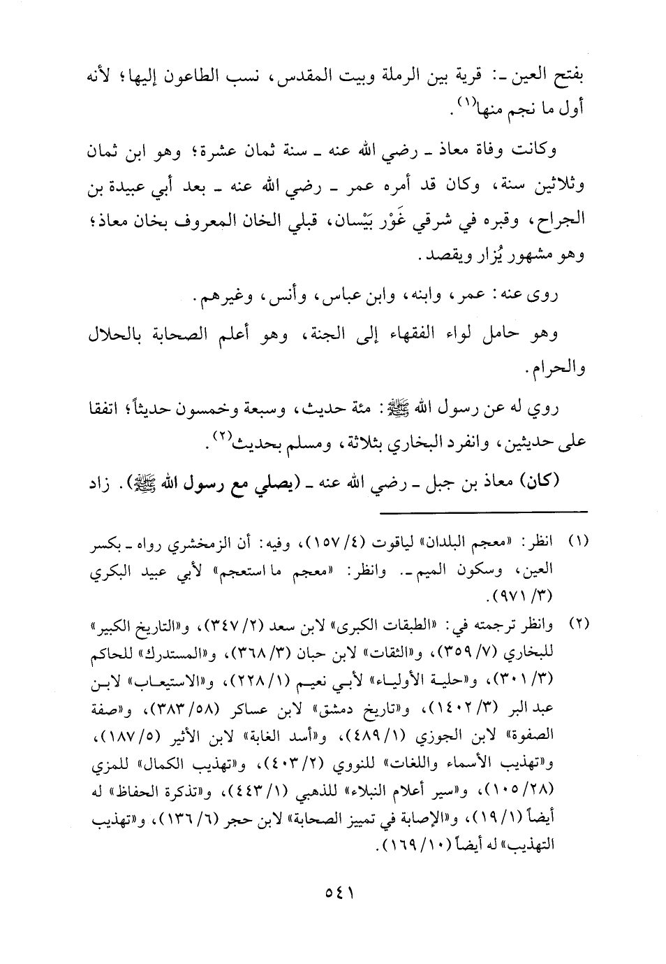 وكانت وفاة معاذ -رضي اللَّه عنه- سنة ثمان عشرة؛ وهو ابن ثمان وثلاثين سنة، وكان قد أمره عمر -رضي اللَّه عنه- بعد أبي عبيدة بن الجراح، وقبره في شرقي غَوْر بَيْسان، قبلي الخان المعروف بخان معاذ؛ وهو مشهور يُزار ويقصد.