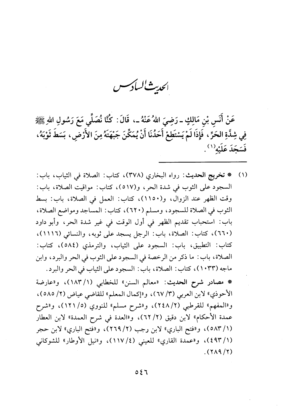 عَنْ أَنَسِ بْنِ مَالِكٍ -رَضِيَ اللَّهُ عَنْهُ-، قَالَ: كنَّا نُصَلِّي مَعَ رَسُولِ اللَّهِ -صلى اللَّه عليه وسلم- فِي شِدَّةِ الحَرِّ، فَإذَا لَمْ يَسْتَطعْ أَحَدُنَا أَنْ يُمَكِّنَ جَبْهَتَهُ مِنَ الأَرْضِ، بَسَطَ ثَوْبَهُ، فَسَجَدَ عَلَيْهِ (١).