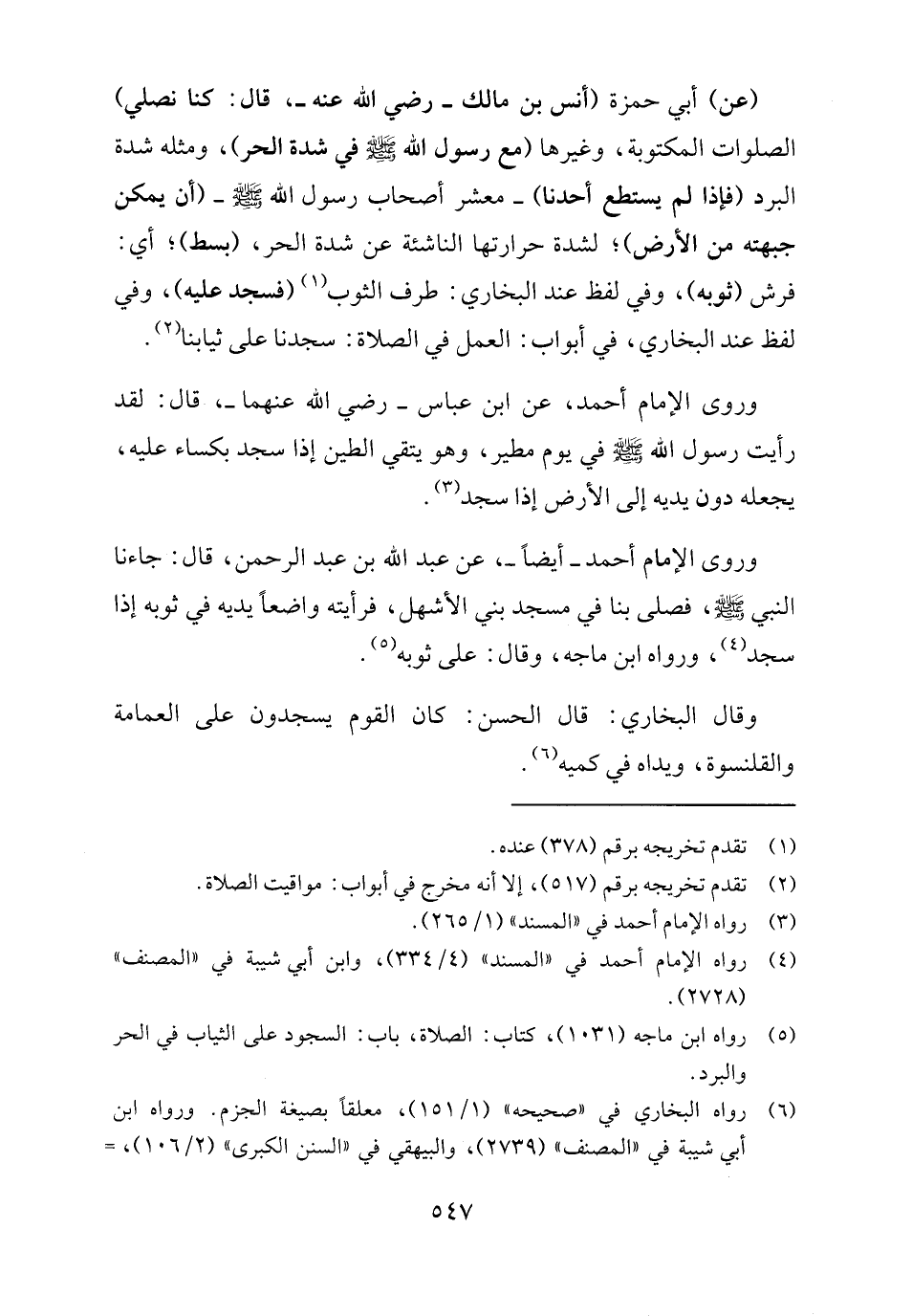 (٥) رواه ابن ماجه (١٠٣١)، كتاب: الصلاة، باب: السجود على الثياب في الحر والبرد.