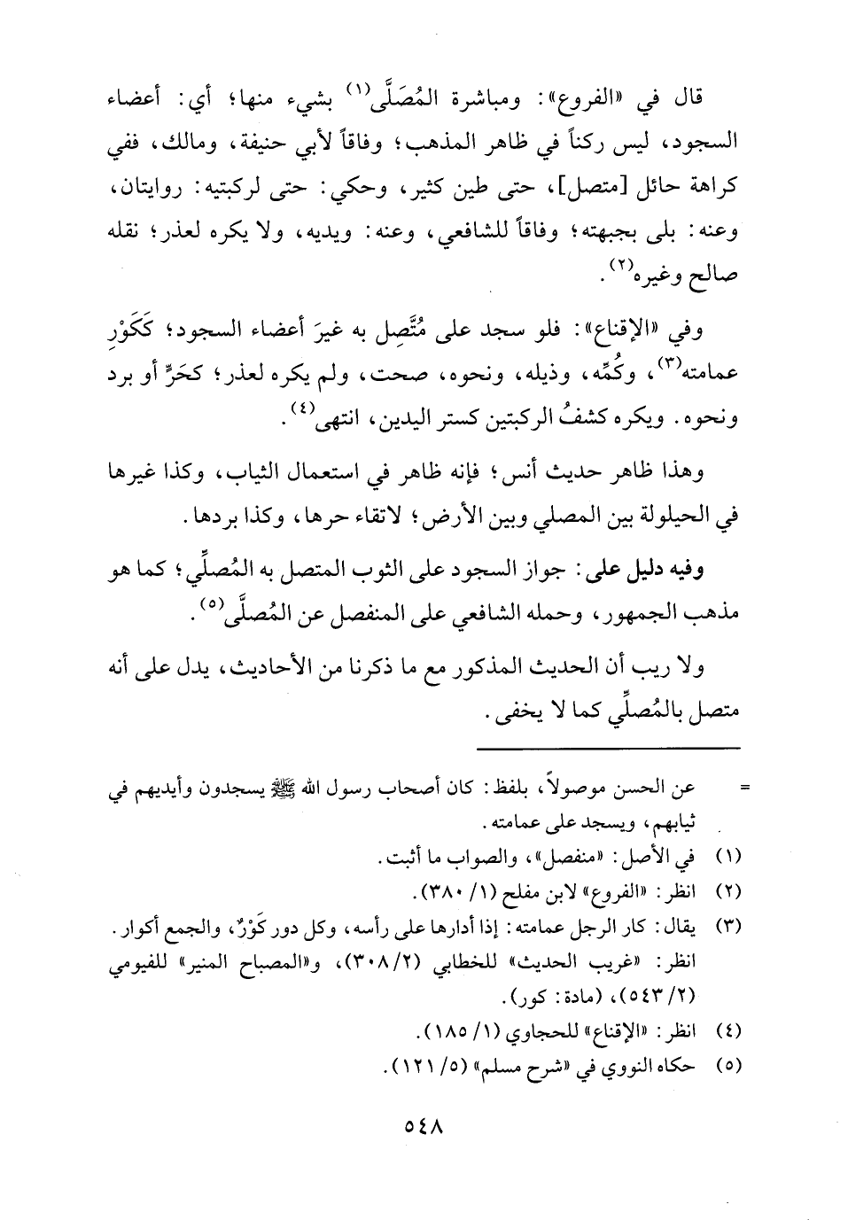 وفي "الإقناع": فلو سجد على مُتَّصِل به غيرَ أعضاء السجود؛ كَكَوْرِ عمامته (٣)، وكُمِّه، وذيله، ونحوه، صحت، ولم يكره لعذر؛ كحَرٍّ أو برد ونحوه. ويكره كشفُ الركبتين كستر اليدين، انتهى (٤).