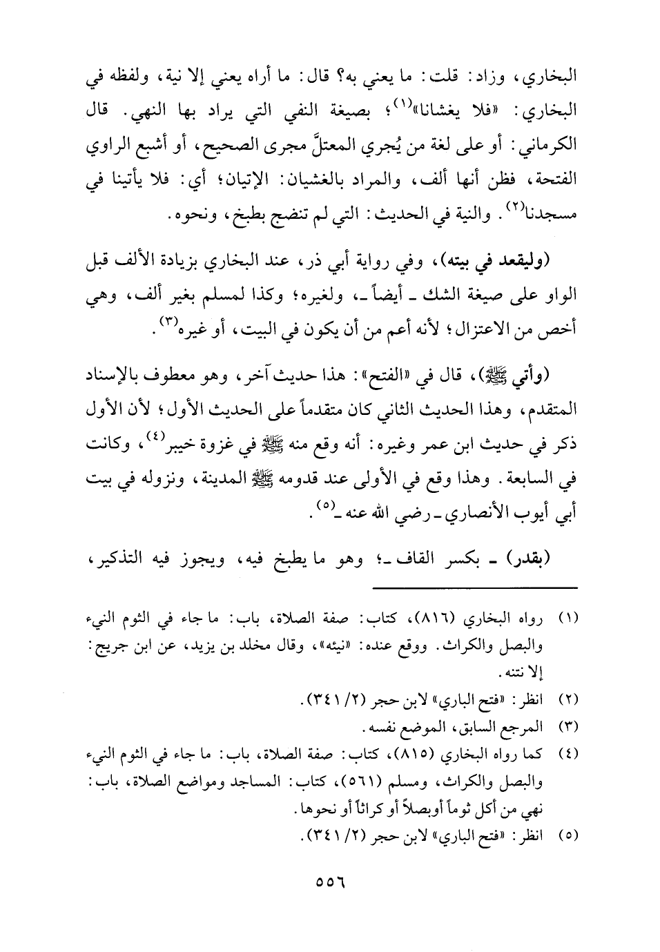 البخاري، وزاد: قلت: ما يعني به؟ قال: ما أراه يعني إلا نية، ولفظه في البخاري: "فلا يغشانا" (١)؛ بصيغة النفي التي يراد بها النهي. قال الكرماني: أو على لغة من يُجري المعتلَّ مجرى الصحيح، أو أشبع الراوي الفتحة، فظن أنها ألف، والمراد بالغشيان: الإتيان؛ أي: فلا يأتينا في مسجدنا (٢). والنية في الحديث: التي لم تنضج بطبخ، ونحوه.