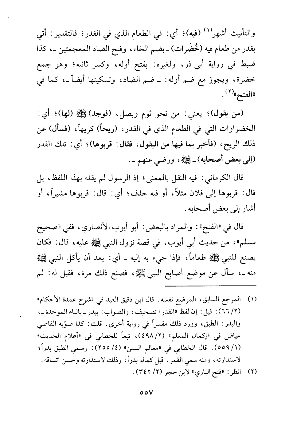(١) المرجع السابق، الموضع نفسه. قال ابن دقيق العيد في "شرح عمدة الأحكام" (٢/ ٦٦): قيل: إن لفظ "القدر" تصحيف، والصواب: ببدر -بالباء الموحدة-، والبدر: الطبق، وورد ذلك مفسرًا في رواية أخرى. قلت: كذا صوّبه القاضي عياض في "إكمال المعلم" (٢/ ٤٩٨)، تبعًا للخطابي في "أعلام الحديث" (١/ ٥٥٩). قال الخطابي في "معالم السنن" (٤/ ٢٥٥): وسمي الطبق بدرًا؛ لاستدارته، ومنه سمي القمر. قبل كماله بدرًا، وذلك لاستدارته وحسن اتساقه.
