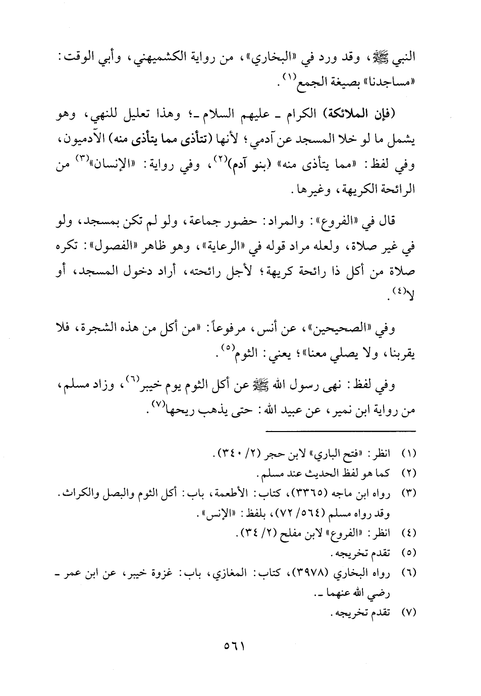 وفي "الصحيحين"، عن أنس، مرفوعًا: "من أكل من هذه الشجرة، فلا يقربنا، ولا يصلي معنا"؛ يعني: الثوم (٥).