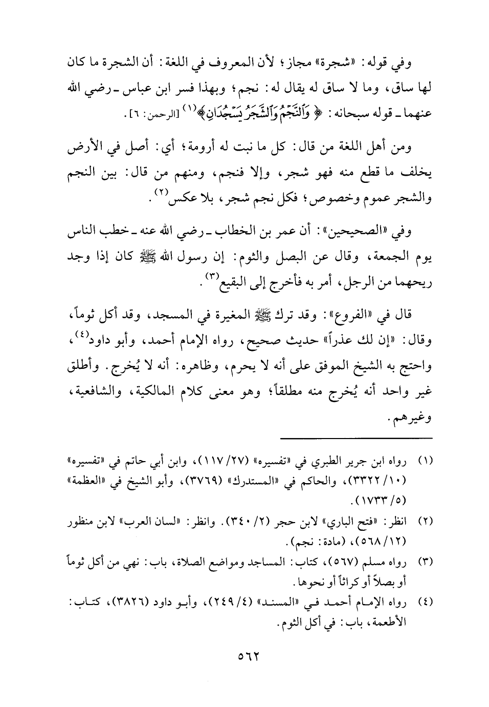 ومن أهل اللغة من قال: كل ما نبت له أرومة؛ أي: أصل في الأرض يخلف ما قطع منه فهو شجر، وإلا فنجم، ومنهم من قال: بين النجم والشجر عموم وخصوص؛ فكل نجم شجر، بلا عكس (٢).