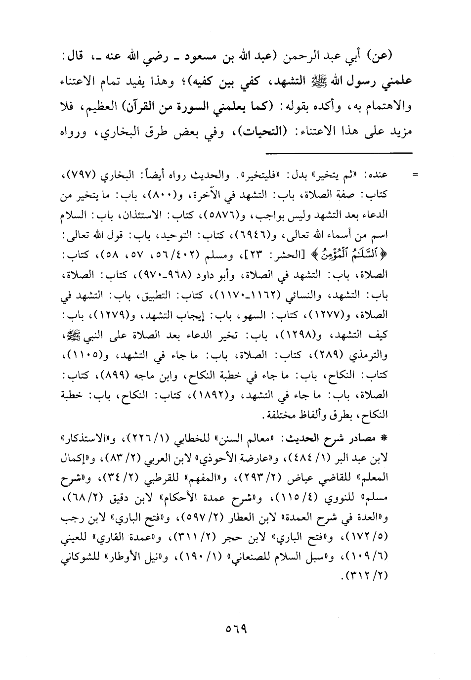 (عن) أبي عبد الرحمن (عبد اللَّه بن مسعود -رضي اللَّه عنه-، قال: علمني رسول اللَّه -صلى اللَّه عليه وسلم- التشهد، كفي بين كفيه)؛ وهذا يفيد تمام الاعتناء والاهتمام به، وأكده بقوله: (كما يعلمني السورة من القرآن) العظيم، فلا مزيد على هذا الاعتناء: (التحيات)، وفي بعض طرق البخاري، ورواه