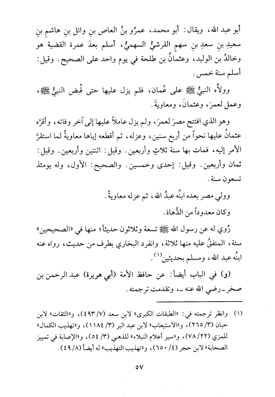 أبو عبد الله، ويقال: أبو محمد، عمرُو بنُ العاص بنِ وائل بنِ هاشمِ بنِ سعيدِ بنِ سعدِ بنِ سهمٍ القرشيُّ السهميُّ، أسلم بعدَ عمرة القضية هو وخالدُ بن الوليد، وعثمانُ بن طلحة في يوم واحد على الصحيح. وقيل: أسلم سنة خمس.