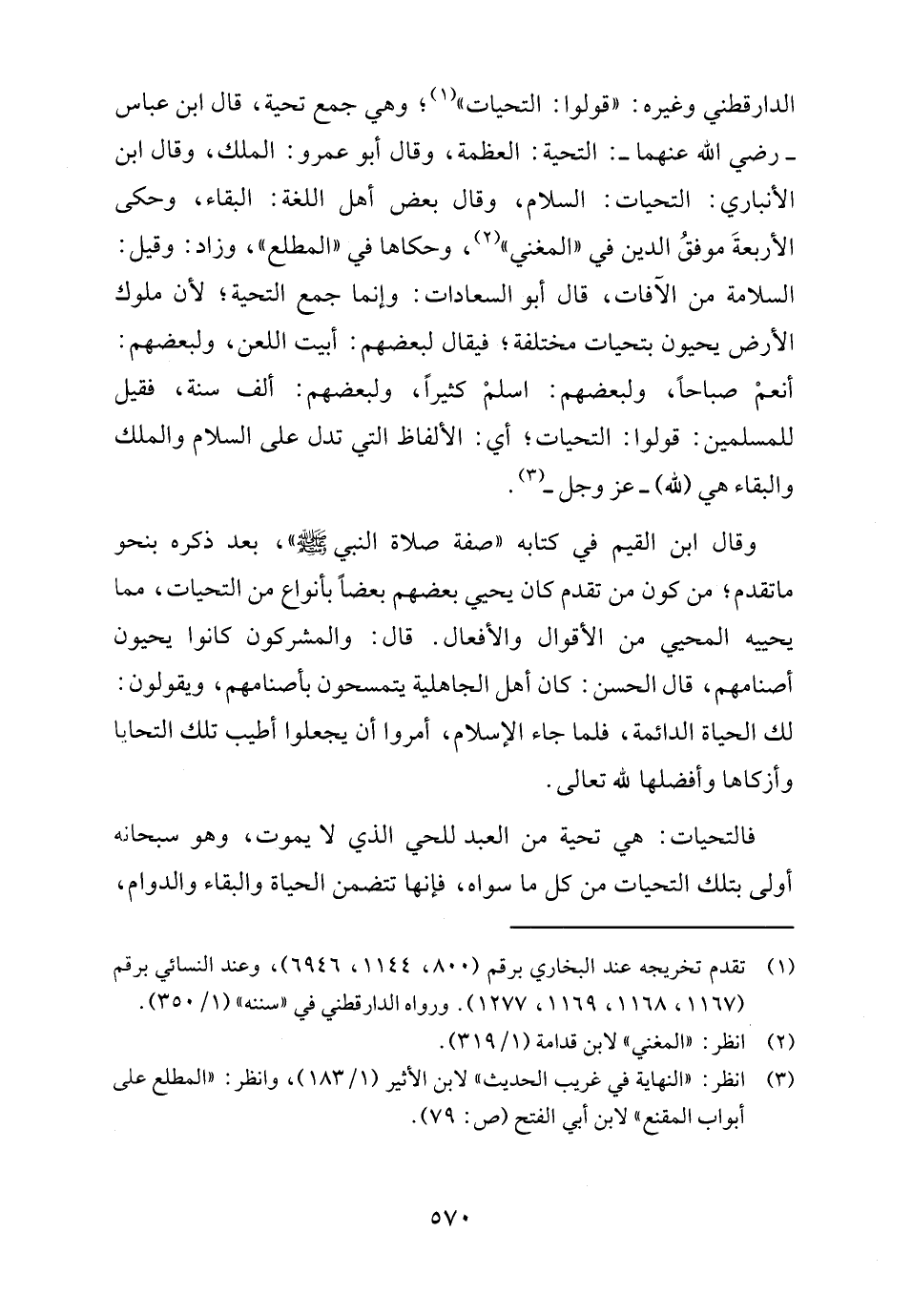 وقال ابن القيم في كتابه "صفة صلاة النبي -صلى اللَّه عليه وسلم-"، بعد ذكره بنحو ما تقدم؛ من كون من تقدم كان يحيي بعضهم بعضًا بأنواع من التحيات، مما يحييه المحيي من الأقوال والأفعال. قال: والمشركون كانوا يحيون أصنامهم، قال الحسن: كان أهل الجاهلية يتمسحون بأصنامهم، ويقولون: لك الحياة الدائمة، فلما جاء الإسلام، أمروا أن يجعلوا أطيب تلك التحابا وأزكاها وأفضلها للَّه تعالى.