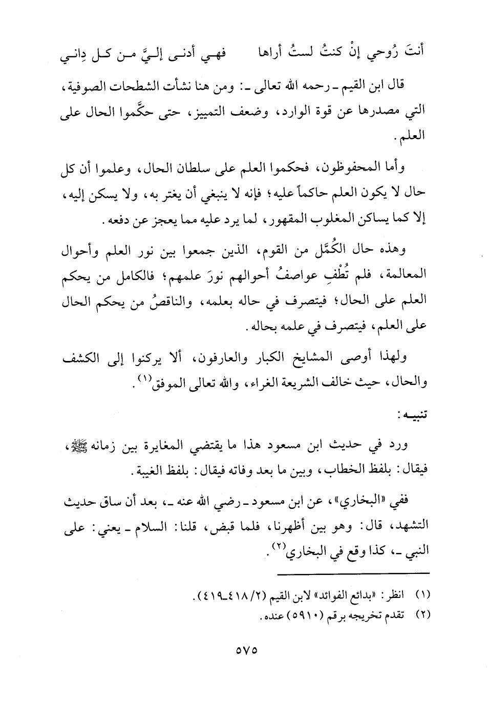 وهذه حال الكُمَّل من القوم، الذين جمعوا بين نور العلم وأحوال المعالمة، فلم تُطْفِ عواصفُ أحوالهم نورَ علمهم؛ فالكامل من يحكم العلم على الحال؛ فيتصرف في حاله بعلمه، والناقصُ من يحكم الحال على العلم، فيتصرف في علمه بحاله.