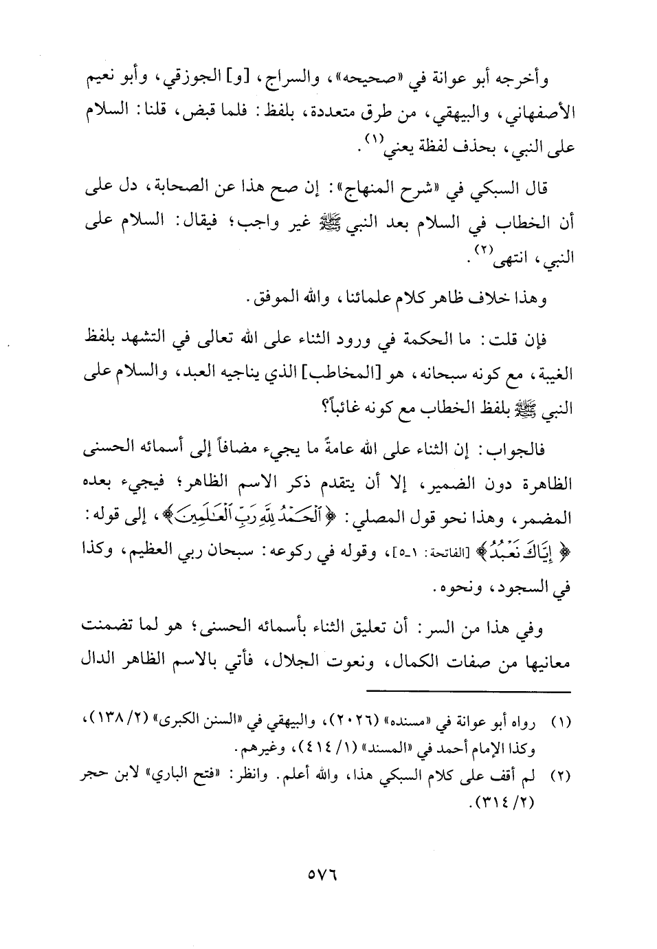 فإن قلت: ما الحكمة في ورود الثناء على اللَّه تعالى في التشهد بلفظ الغيبة، مع كونه سبحانه، هو [المخاطب] الذي يناجيه العبد، والسلام على النبي -صلى اللَّه عليه وسلم- بلفظ الخطاب مع كونه غائبًا؟