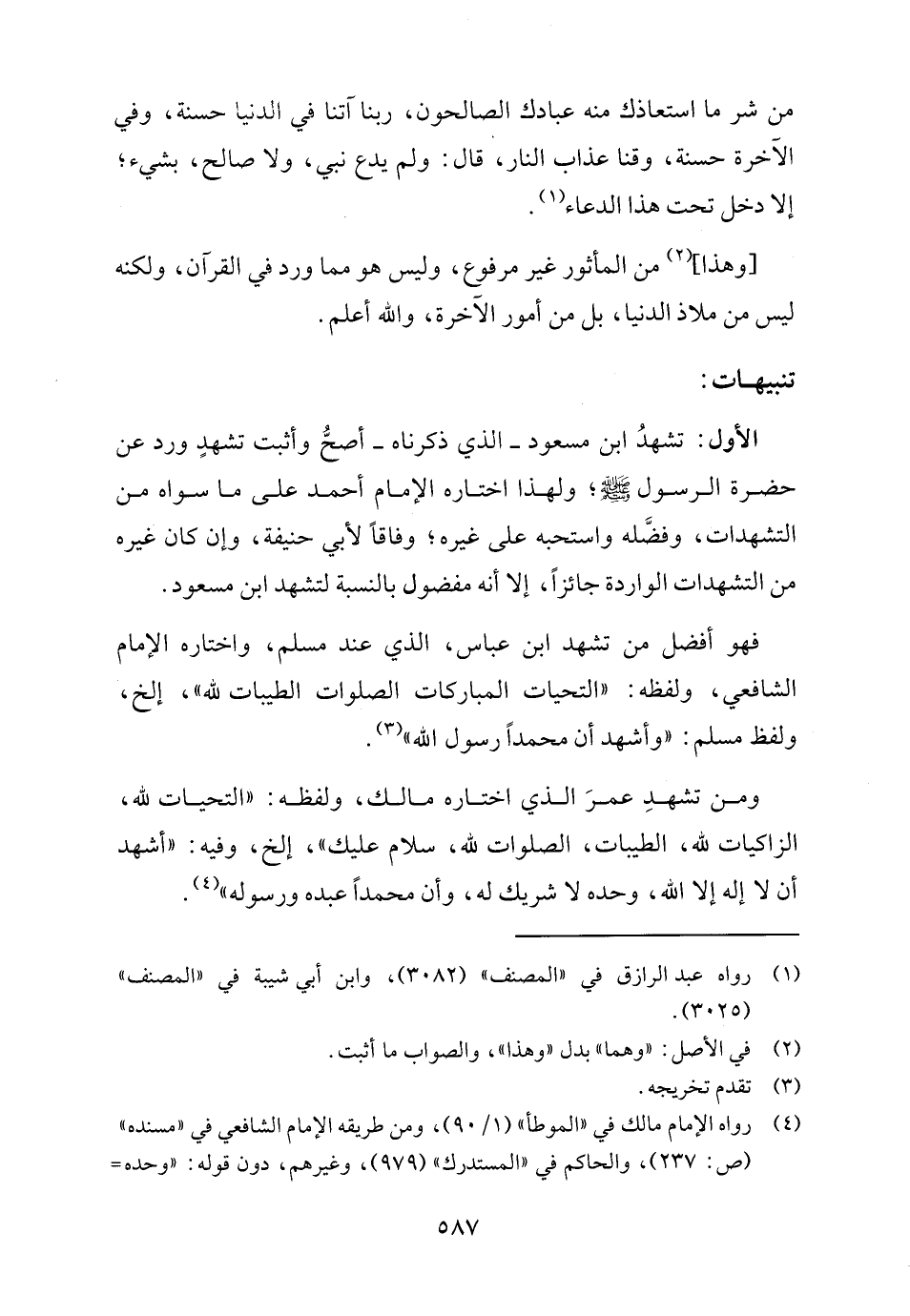 الأول: تشهدُ ابن مسعود -الذي ذكرناه- أصحُّ وأثبت تشهدٍ ورد عن حضرة الرسول -صلى اللَّه عليه وسلم-؛ ولهذا اختاره الإمام أحمد على ما سواه من التشهدات، وفضَّله واستحبه على غيره؛ وفاقًا لأبي حنيفة، وإن كان غيره من التشهدات الواردة جائزًا، إلا أنه مفضول بالنسبة لتشهد ابن مسعود.