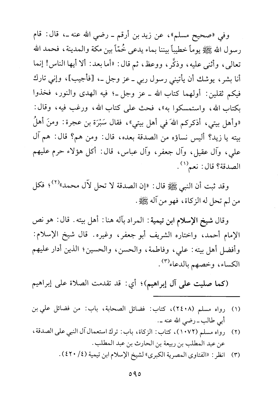 وفي "صحيح مسلم"، عن زيد بن أرقم -رضي اللَّه عنه-، قال: قام رسول اللَّه -صلى اللَّه عليه وسلم- يومًا خطيبًا بيننا بماء يدعى خُمًّا بين مكة والمدينة، فحمد اللَّه تعالى، وأثنى عليه، وذكَّر، ووعظ، ثم قال: "أما بعد: ألا أيها الناس! إنما أنا بشر، يوشك أن يأتيني رسول ربي -عز وجل-، [فأجيب]، وإني تارك فيكم ثقلين: أولهما كتاب اللَّه -عز وجل-، فيه الهدى والنور، فخذوا بكتاب اللَّه، واستمسكوا به"، فحث على كتاب اللَّه، ورغب فيه، وقال: "وأهل بيتي، أذكركم اللَّهَ في أهل بيتي"، فقال سَبْرَة بن عجرة: ومنَ أهلُ بيته يا زيد؟ أليس نساؤه من الصدقهَ بعده، قال: ومن هم؟ قال: هم آل علي، وآل عقيل، وآل جعفر، وآل عباس، قال: أكل هؤلاء حرم عليهم الصدقة؟ قال: نعم (١).