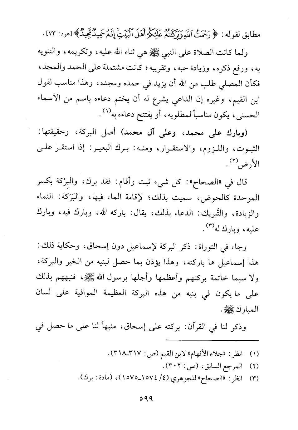 ولما كانت الصلاة على النبي -صلى اللَّه عليه وسلم- هي ثناء اللَّه عليه، وتكريمه، والتنويه به، ورفع ذكره، وزيادة حبه، وتقريبه، كانت مشتملة على الحمد والمجد، فكأن المصلي طلب من اللَّه أن يزيد في حمده ومجده، وهذا مناسب لقول ابن القيم، وغيره إن الداعي يشرع له أن يختم دعاءه باسم من الأسماء الحسنى، يكون مناسبًا لمطلوبه، أو يفتتح دعاءه به (١).