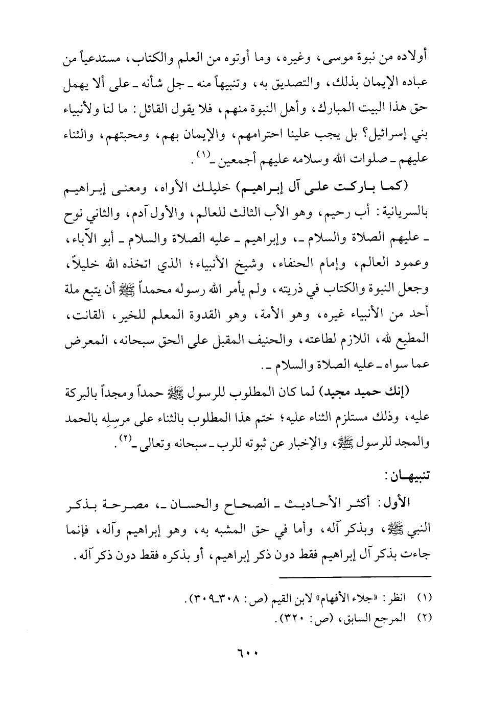 الأول: أكثر الأحاديث -الصحاح والحسان-، مصرحة بذكر النبي -صلى اللَّه عليه وسلم-، وبذكر آله، وأما في حق المشبه به، وهو إبراهيم وآله، فإنما جاءت بذكر آل إبراهيم فقط دون ذكر إبراهيم، أو بذكره فقط دون ذكر آله.