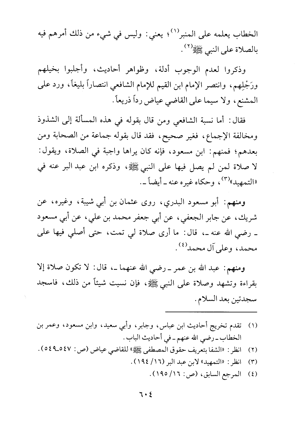 فقال: أما نسبة الشافعي ومن قال بقوله في هذه المسألة إلى الشذوذ ومخالفة الإجماع، فغير صحيح، فقد قال بقوله جماعة من الصحابة ومن بعدهم؛ فمنهم: ابن مسعود، فإنه كان يراها واجبة في الصلاة، ويقول: لا صلاة لمن لم يصل فيها على النبي -صلى اللَّه عليه وسلم-، وذكره ابن عبد البر عنه في "التمهيد" (٣)، وحكاه غيره عنه -أيضًا-.