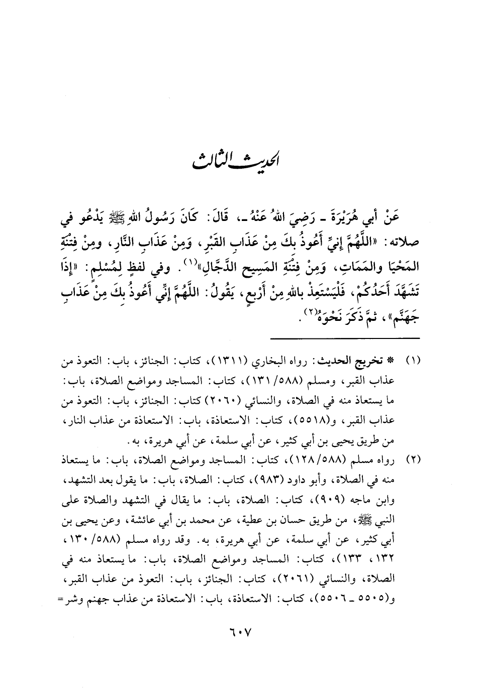 (٢) رواه مسلم (٥٨٨/ ١٢٨)، كتاب: المساجد ومواضع الصلاة، باب: ما يستعاذ منه في الصلاة، وأبو داود (٩٨٣)، كتاب: الصلاة، باب: ما يقول بعد التشهد، وابن ماجه (٩٠٩)، كتاب: الصلاة، باب: ما يقال في التشهد والصلاة على النبي -صلى اللَّه عليه وسلم-، من طريق حسان بن عطية، عن محمد بن أبي عائشة، وعن يحيى بن أبي كثير، عن أبي سلمة، عن أبي هريرة، به. وقد رواه مسلم (٥٨٨/ ١٣٠، ١٣٢، ١٣٣)، كتاب: المساجد ومواضع الصلاة، باب: ما يستعاذ منه في الصلاة، والنسائي (٢٠٦١)، كتاب: الجنائز، باب: التعوذ من عذاب القبر، و (٥٥٠٥ - ٥٥٠٦)، كتاب: الاستعاذة، باب: الاستعاذة من عذاب جهنم وشر =