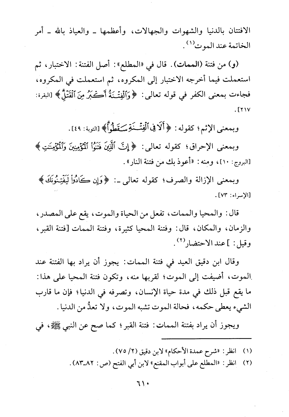 (و) من فتنة (الممات). قال في "المطلع": أصل الفتنة: الاختبار، ثم استعملت فيما أخرجه الاختبار إلى المكروه، ثم استعملت في المكروه، فجاءت بمعنى الكفر في قوله تعالى: {وَالْفِتْنَةُ أَكْبَرُ مِنَ الْقَتْلِ} [البقرة: ٢١٧].