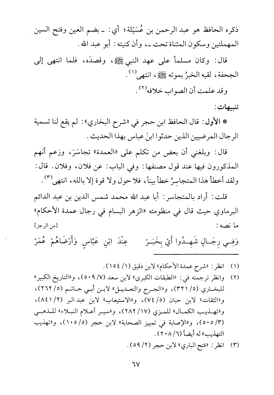 قلت: أراد بالمتجاسر: أبا عبد الله محمد شمس الدين بن عبد الدائم البرماوي حيث قال في منظومته "الزهر البسام في رجال عمدة الأحكام" ما نصه: [من الرجز]