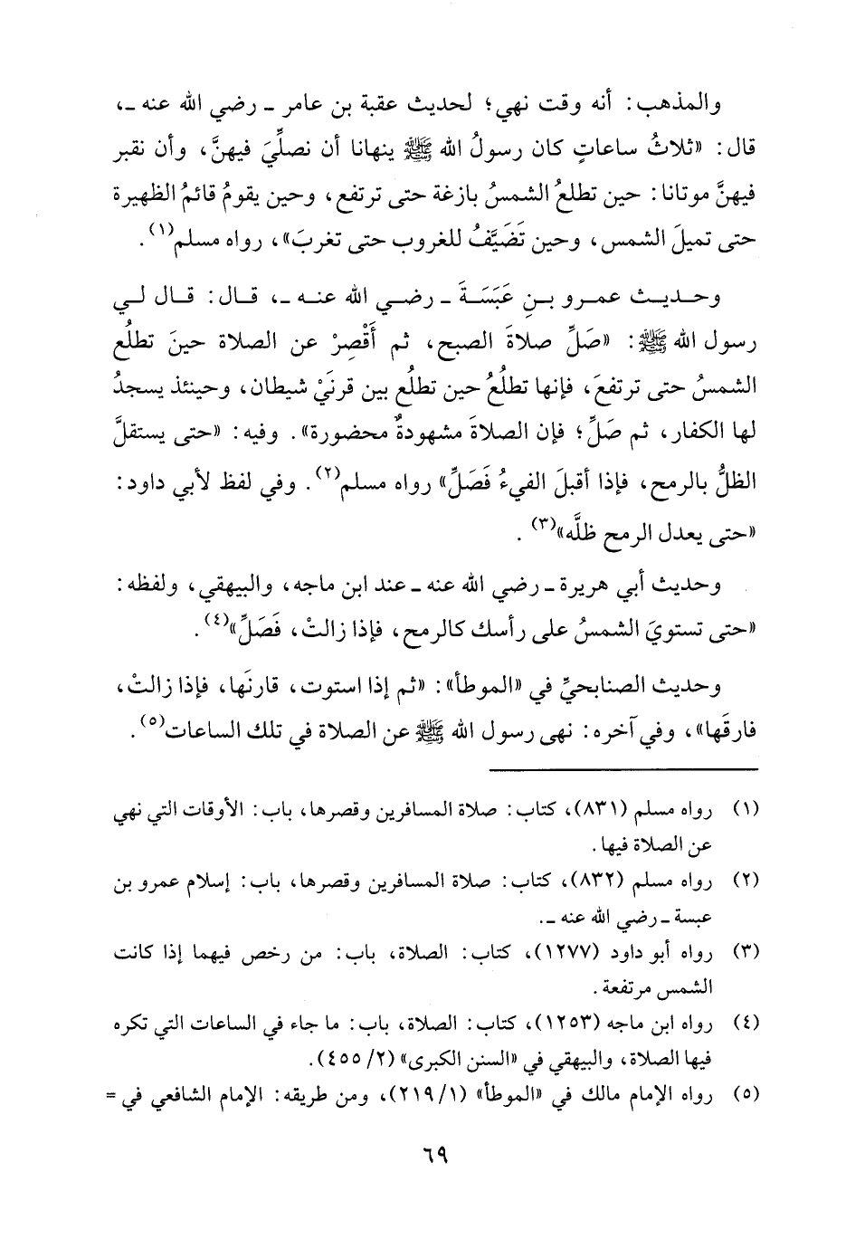 وحديث عمرو بنِ عَبَسَةَ - رضي الله عنه -، قال: قال لي رسول الله - صلى الله عليه وسلم -: "صَلِّ صلاةَ الصبح، ثم أَقْصِرْ عن الصلاة حينَ تطلُع الشمسُ حتى ترتفعَ، فإنها تطلُعُ حين تطلُع بين قرنَيْ شيطان، وحينئذ يسجدُ لها الكفار، ثم صَلِّ؛ فإن الصلاةَ مشهودةٌ محضورة". وفيه: "حتى يستقلَّ الظلُّ بالرمح، فإذا أقبلَ الفيءُ فَصَلِّ" رواه مسلم (٢). وفي لفظ لأبي داود: "حتى يعدل الرمح ظلَّه" (٣).