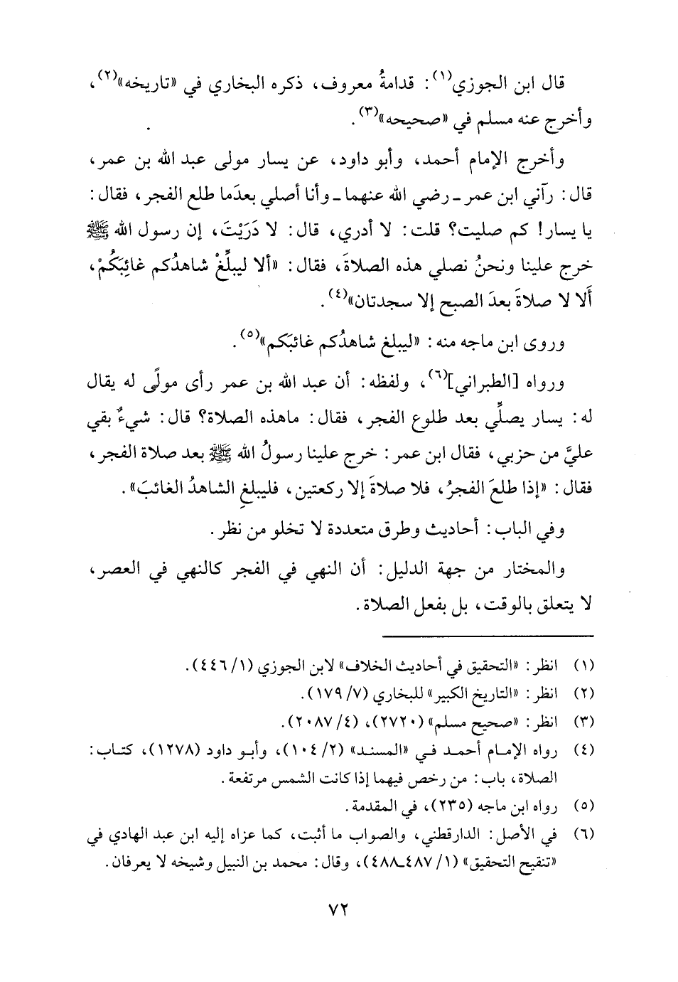 ورواه [الطبراني] (٦)، ولفظه: أن عبد الله بن عمر رأى مولًى له يقال له: يسار يصلِّي بعد طلوع الفجر، فقال: ما هذه الصلاة؟ قال: شيءٌ لا بقي عليَّ من حزبي، فقال ابن عمر: خرج علينا رسولُ الله - صلى الله عليه وسلم - بعد صلاة الفجر، فقال: "إذا طلعَ الفجرُ، فلا صلاةَ إلا ركعتين، فليبلغِ الشاهدُ الغائبَ".