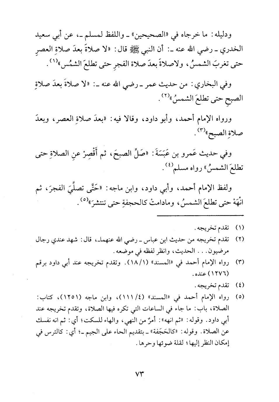 وفي حديث عَمرو بن عَبَسَةَ: "صلِّ الصبحَ، ثم أَقصِرْ عنِ الصلاةِ حتى تطلعَ الشمسُ" رواه مسلم (٤).