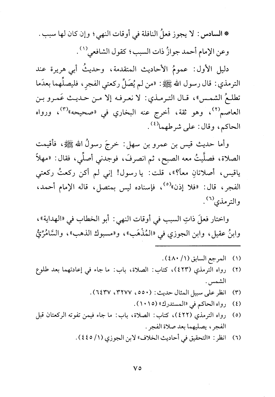 * السادس: لا يجوز فعلُ النافلة في أوقات النهي؛ وإن كان لها سبب.