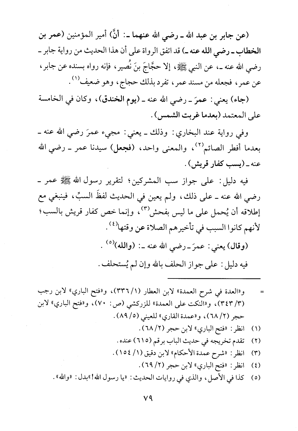 (عن جابر بن عبد الله - رضي الله عنهما -: أنَّ) أمير المؤمنين (عمر بن الخطاب - رضي الله عنه -) قد اتفق الرواة على أن هذا الحديث من رواية جابر - رضي الله عنه -، عن النبي - صلى الله عليه وسلم -، إلا حجَّاجَ بنَ نُصير، فإنه رواه بسنده عن جابر، عن عمر، فجعله من مسند عمر، تفرد بذلك حجاج، وهو ضعيف (١).