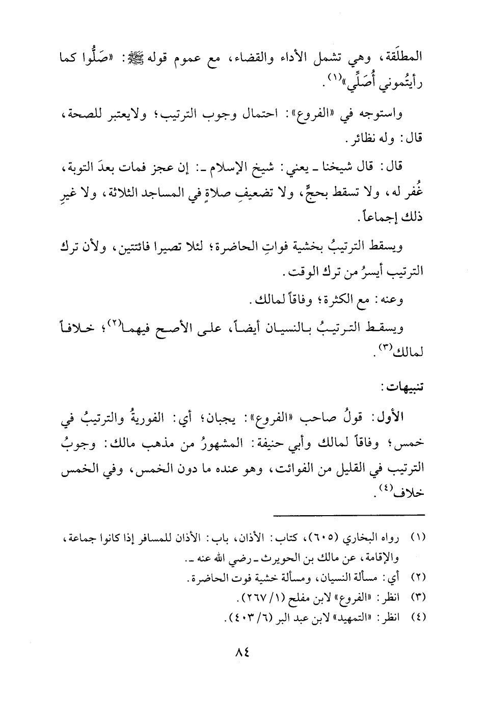 الأول: قولُ صاحب "الفروع": يجبان؛ أي: الفوريةُ والترتيبُ في خمس؛ وفاقًا لمالك وأبي حنيفة: المشهورُ من مذهب مالك: وجوبُ الترتيب في القليل من الفوائت، وهو عنده ما دون الخمس، وفي الخمس خلاف (٤).