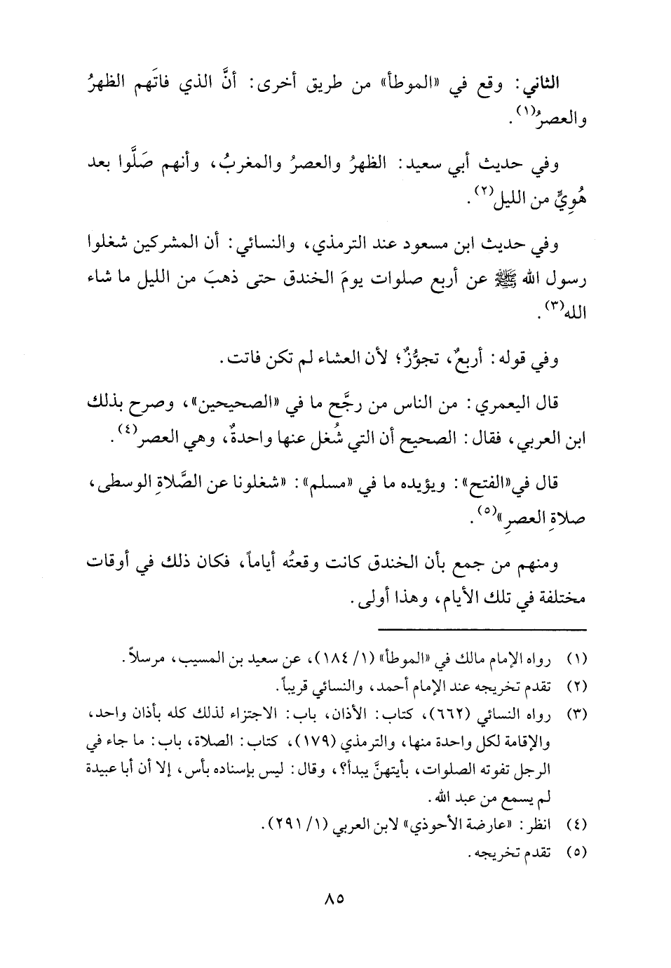 وفي حديث ابن مسعود عند الترمذي، والنسائي: أن المشركين شغلوا رسول الله - صلى الله عليه وسلم - عن أربع صلوات يومَ الخندق حتى ذهبَ من الليل ما شاء الله (٣).