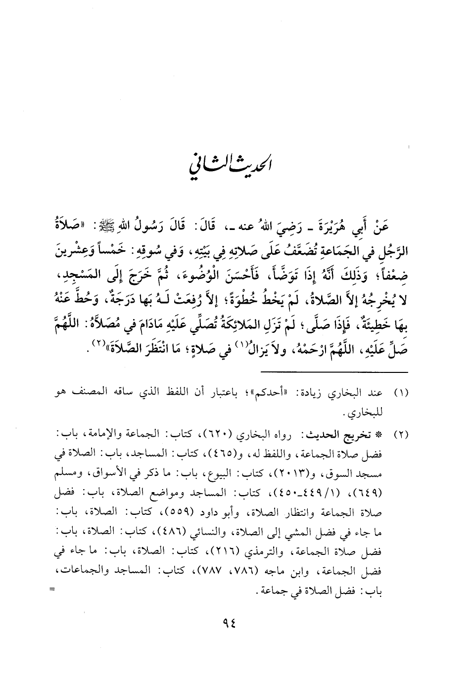 عَنْ أَبِي هُرَيْرَةَ - رَضِيَ اللهُ عنه -، قَالَ: قَالَ رَسُولُ اللهِ - صلى الله عليه وسلم -: "صَلاَةُ الرَّجُلِ في الجَمَاعةِ تُضَعَّفُ عَلَى صَلاتِهِ فِي بَيْتِهِ، وَفي سُوقِهِ: خَمْسًا وَعِشْرينَ ضِعْفًا، وَذَلِكَ أَنّهُ إِذَا تَوَضَّأَ، فَأَحْسَنَ الْوُضُوءَ، ثُمَّ خَرَجَ إِلَى المَسْجِدِ، لا يُخْرِجُهُ إلأَ الصَّلاةُ، لَمْ يَخْطُ خُطْوَةً، إلأَ رُفِعَتْ لَهُ بَها دَرَجَةٌ، وَحُطَّ عَنْهُ بهَا خَطِيئَةٌ، فَاذَا صَلَّى، لَمْ تَزَلِ المَلائِكَةُ تُصَلِّي عَلَيْهِ مَادَامَ في مُصَلاَّهُ: اللَّهُمَّ صَلِّ عَلَيْهِ، اللَّهُمَّ ارْحَمْهُ، ولاَ يَزالُ (١) في صَلاةٍ؛ مَا انْتَظَرَ الصَّلاَةَ" (٢).