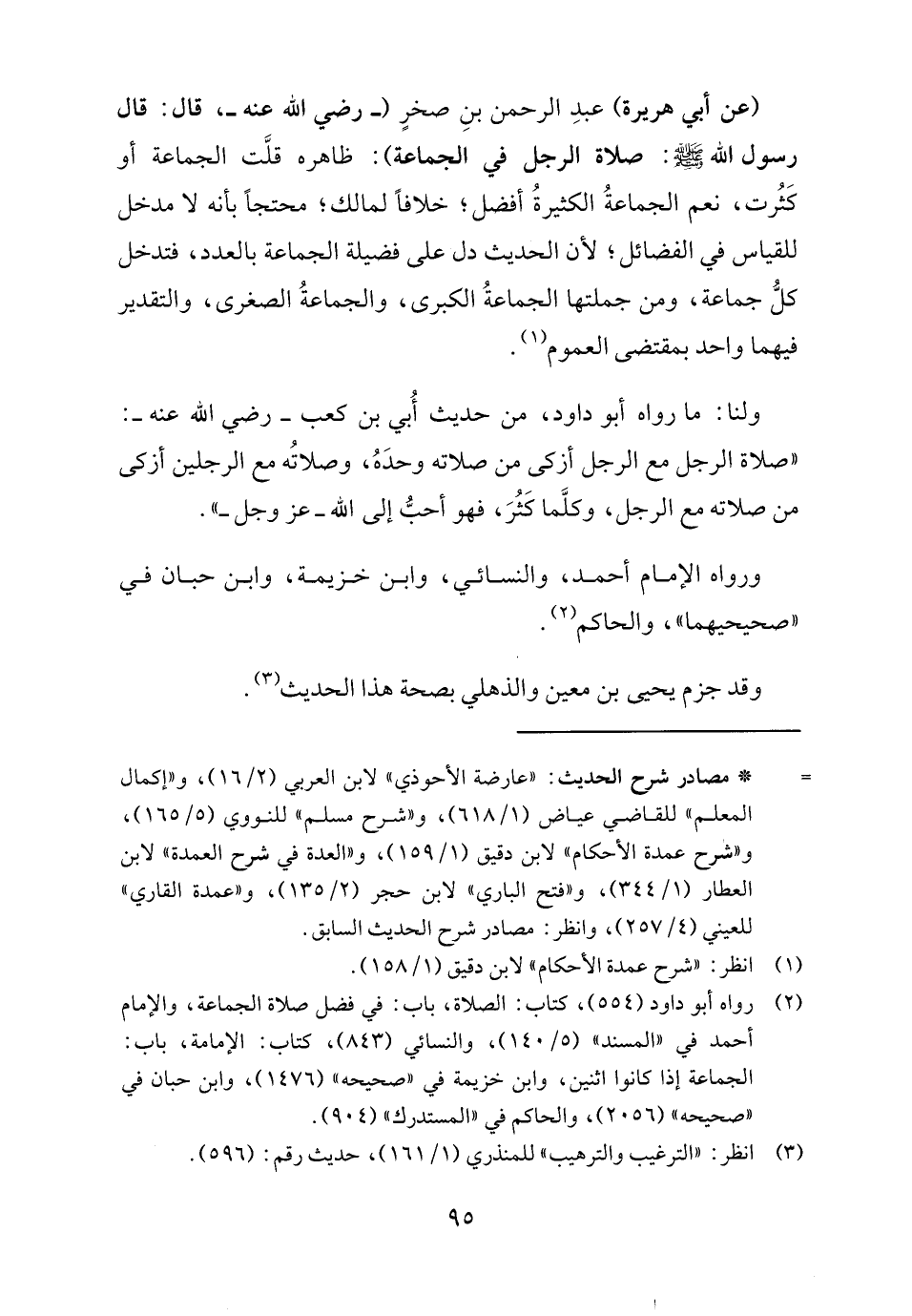 (عن أبي هريرة) عبدِ الرحمن بنِ صخرٍ (- رضي الله عنه -، قال: قال رسول الله - صلى الله عليه وسلم -: صلاة الرجل في الجماعة): ظاهره قلَّت الجماعة أو كَثُرت، نعم الجماعةُ الكثيرةُ أفضل؛ خلافًا لمالك؛ محتجًا بأنه لا مدخل للقياس في الفضائل؛ لأن الحديث دل على فضيلة الجماعة بالعدد، فتدخل كلُّ جماعة، ومن جملتها الجماعةُ الكبرى، والجماعةُ الصغرى، والتقدير فيهما واحد بمقتضى العموم (١).
