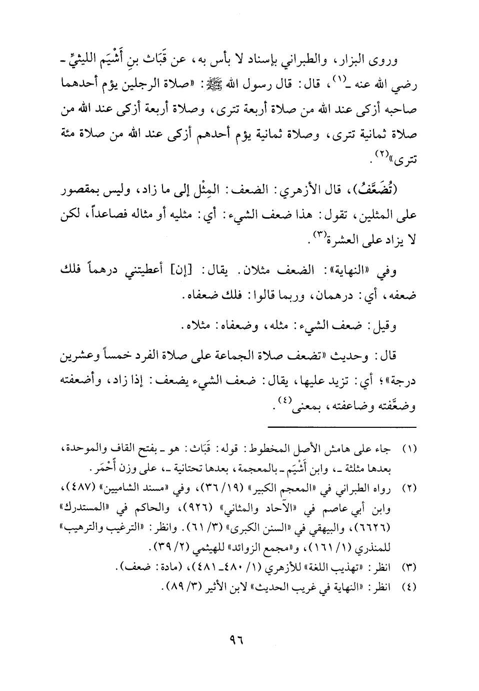قال: وحديث "تضعف صلاة الجماعة على صلاة الفرد خمسًا وعشرين درجة"؛ أي: تزيد عليها، يقال: ضعف الشيء يضعف: إذا زاد، وأضعفته وضعَّفته وضاعفته، بمعنى (٤).