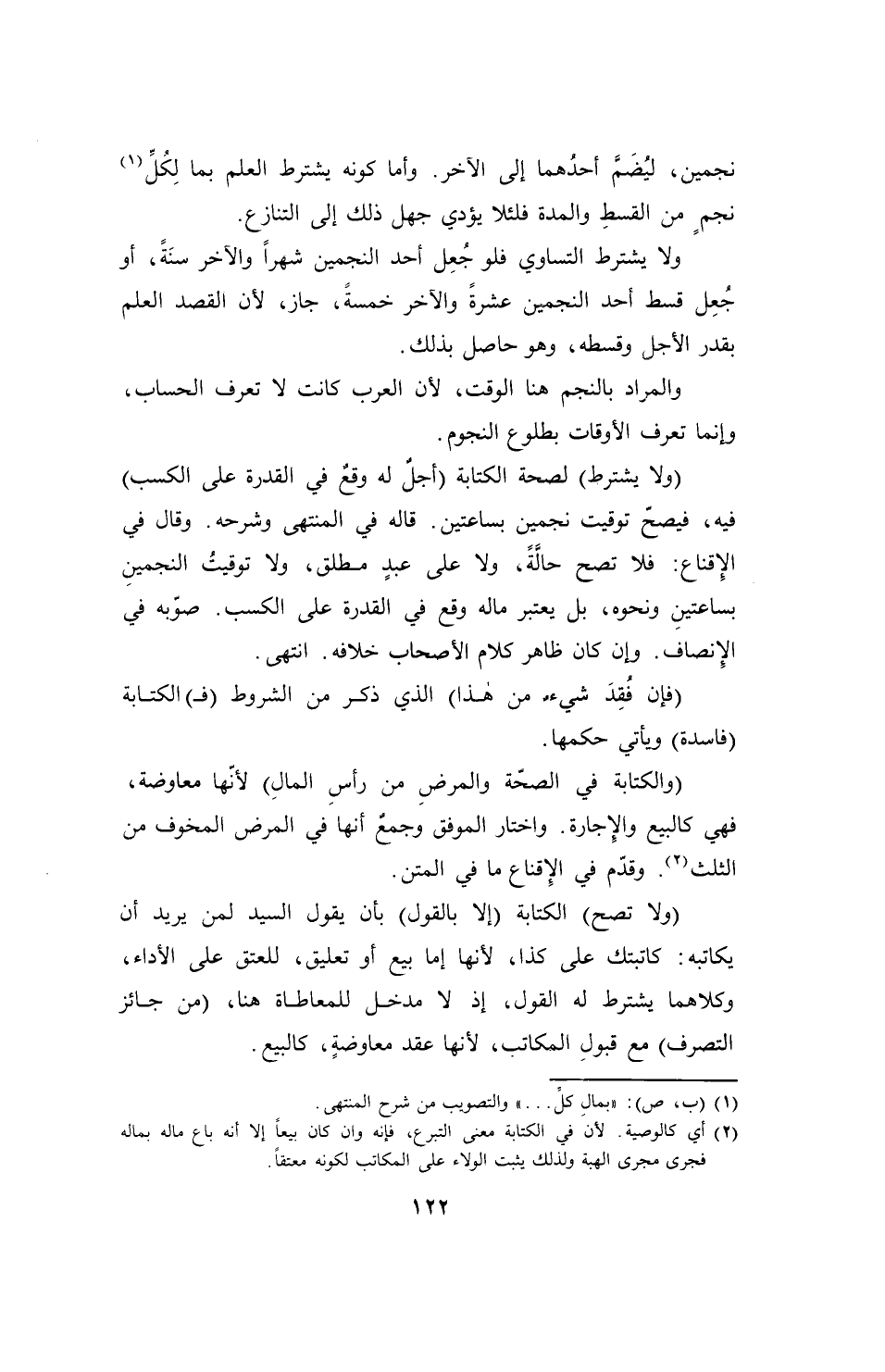 (ولا يشترط) لصحة الكتابة (أجلٌ له وقعٌ في القدرة على الكسب) فيه، فيصحّ توقيت نجمين بساعتين. قاله في المنتهى وشرحه. وقال في الإقناع: فلا تصح حالَّةً , ولا على عبدٍ مطلق، ولا توقيت النجمينِ بساعتينِ ونحوه، بل يعتبر ماله وقع في القدرة على الكسب. صوّبه في الإنصاف. وإن كان ظاهر كلام الأصحاب خلافه. انتهى.
