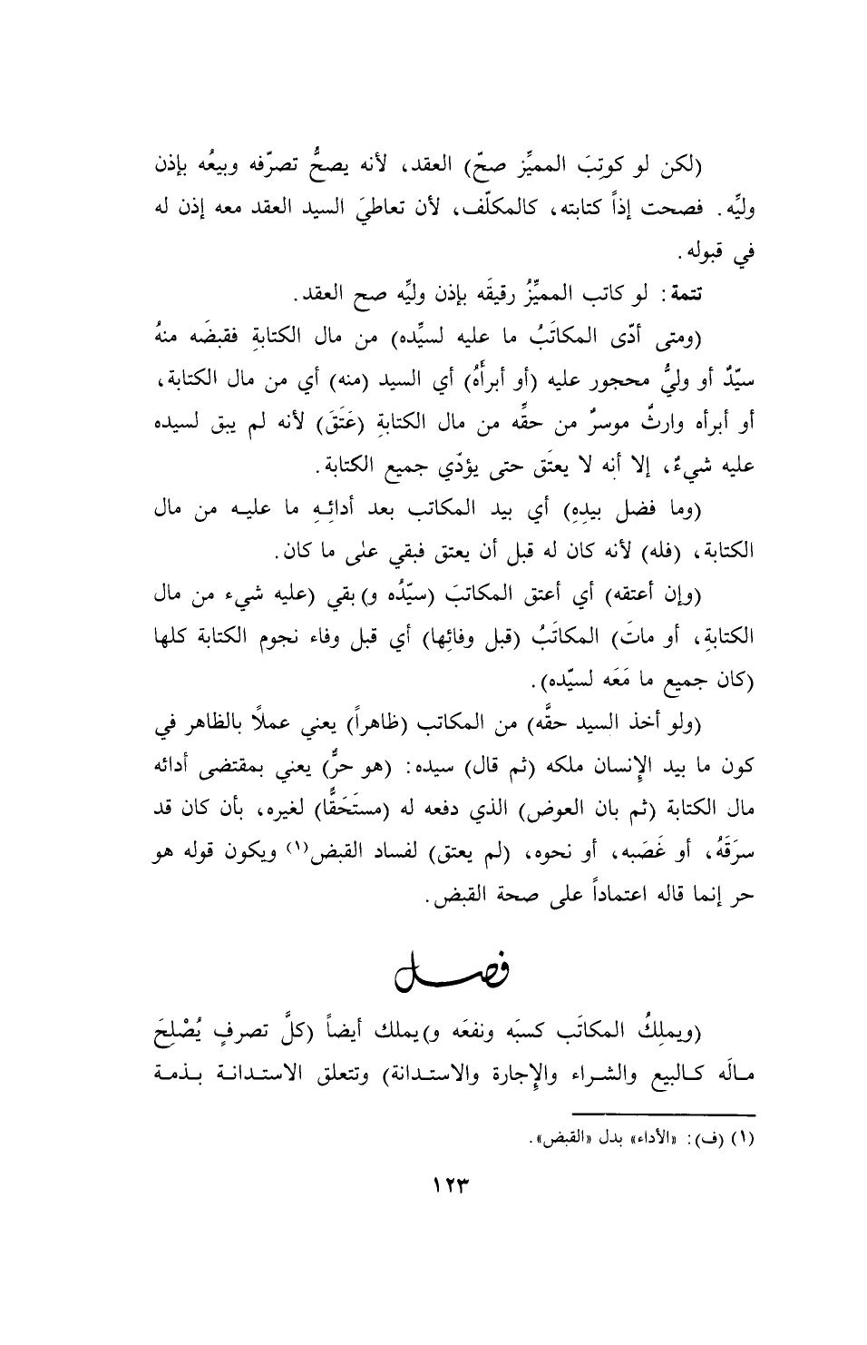 (ويملِكُ المكاتَب كسبَه ونفعَه و) يملك أيضاً (كلَّ تصرفٍ يُصْلِحَ مالَه كالبيع والشراء والإِجارة والاستدانة) وتتعلق الاستدانة بذمة