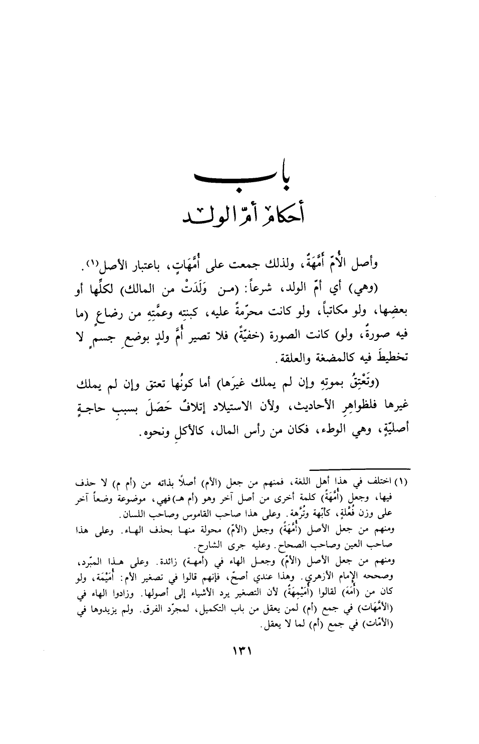 (¬1) اختلف في هذا أهل اللغة، فمنهم من جعل (الأم) أصلاً بذاته من (أم م) لا حذف فيها، وجعل (أُمَّهَةً) كلمة أخرى من أصل آخر وهو (أمهِ) فهي، موضوعة وضعًا آخر على وزن فُعلةٍ، كأبّهة وتُرَّهة. وعلى هذا صاحب القاموس وصاحب اللسان.