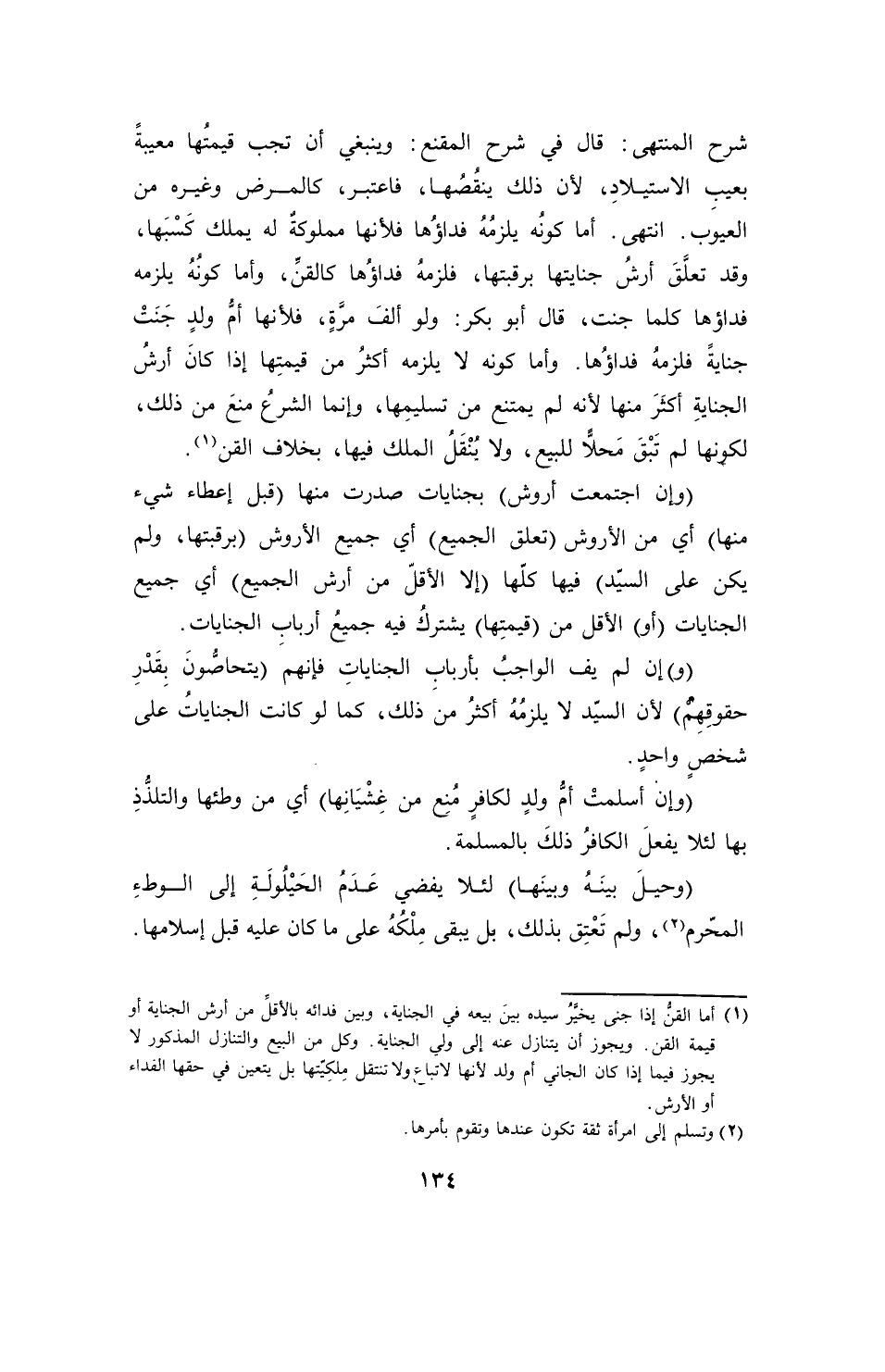 شرح المنتهى: قال في شرح المقنع: وينبغي أن تجب قيمتُها معيبةً بعيب الاستيلادِ، لأن ذلك ينقُصُها، فاعتبر، كالمرض وغيره من العيوَب. انتهى. أما كونُه يلزمُهُ فداؤُها فلأنها مملوكةٌ له يملك كَسْبَها، وقد تعلَّقَ أرشُ جنايتها برقبتها، فلزمهُ فداؤها كالقنِّ، وأما كونُهُ يلزمه فداؤها كلما جنت، قال أبو بكر: ولو ألفَ مرَّةٍ، فلأنها أمُّ ولدٍ جَنَتْ جنايةً فلزمهُ فداؤُها. وأما كونه لا يلزمه أكثرُ من قيمتِها إذا كانَ أرشُ الجنايةِ أكثَرَ منها لأنه لم يمتنع من تسليمِها، وإنما الشرعُ منعَ من ذلك، لكونها لم تَبْقَ مَحلاًّ للبيع، ولا يُنْقَلُ الملك فيها، بخلاف القن (¬1).