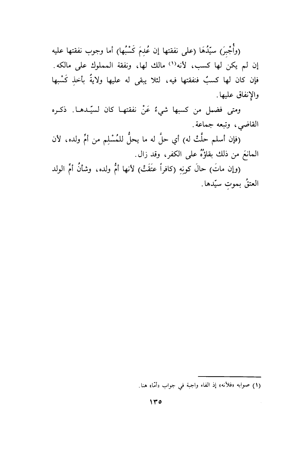 (وأُجْبِر) سيّدُهَا (على نفقتها إن عُدِمَ كَسْبها) أما وجوب نفقتها عليه إن لم يكن لها كسب، لأنه (¬1) مالك لها، ونفقة المملوك على مالكه. فإن كان لها كسبٌ فنفقتها فيه، لئلا يبقى له عليها ولايةٌ بأخذِ كَسْبها والإنفاق عليها.