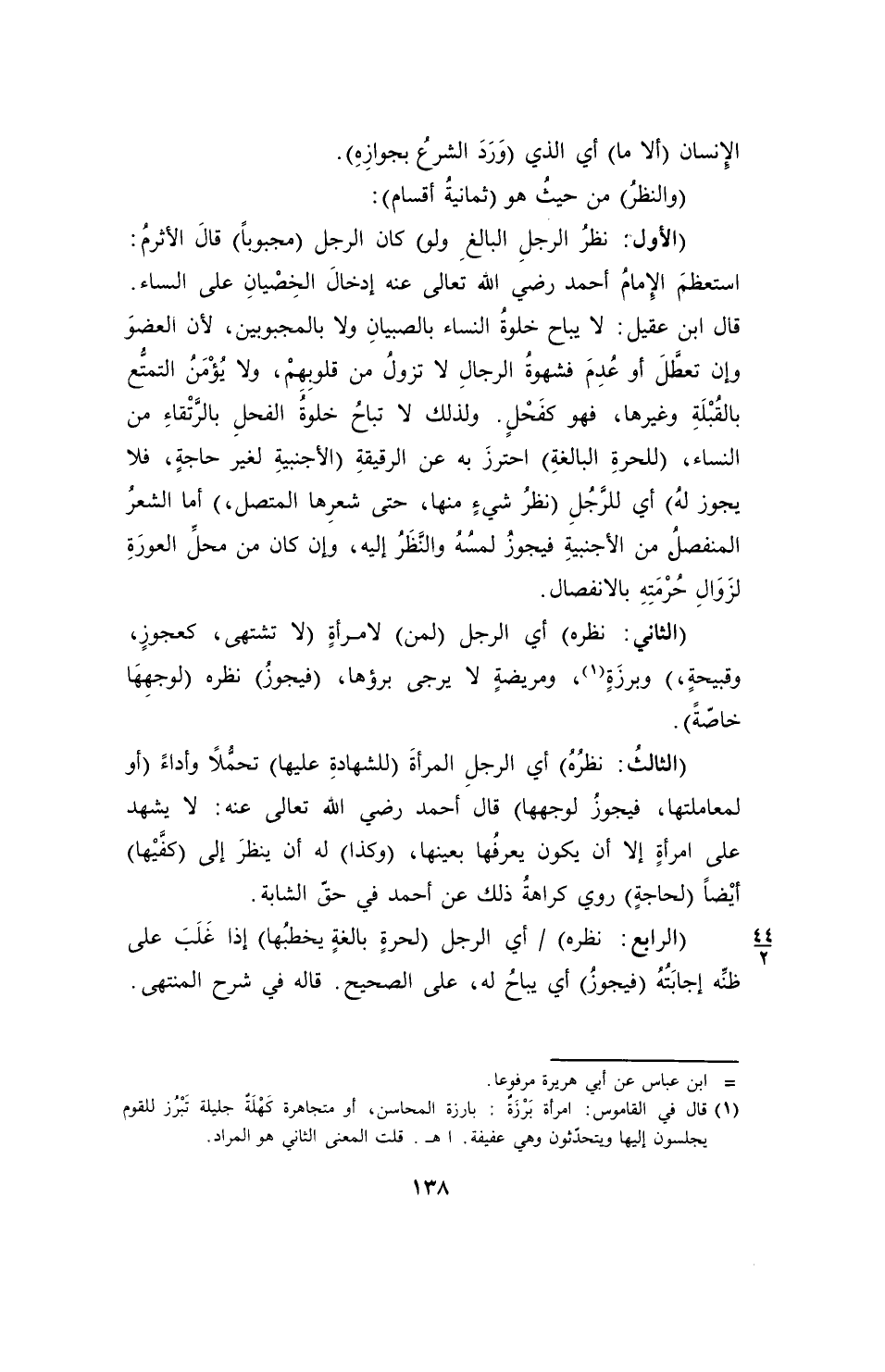 (الأول: نظرُ الرجلِ البالغِ ولو) كان الرجل (مجبوباً) قالَ الأثرمُ: استعظمَ الإِمامُ أحمد رضي الله تعالى عنه إدخالَ الخِصْيانِ على النساء. قال ابن عقيل: لا يباح خلوةُ النساء بالصبيانِ ولا بالمجبوبين، لأن العضوَ وإن تعطَّلَ أو عُدِمَ فشهوةُ الرجالِ لا تزولُ من قلوبِهِمْ، ولا يُؤْمَنُ التمتُّع بالقُبْلَةِ وغيرها، فهو كفَحْلٍ. ولذلك لا تباحُ خلوةُ الفحلِ بالرَّتْقاءِ من النساء، (للحرةِ البالغةِ) احترزَ به عن الرقيقةِ (الأجنبيةِ لغير حاجةٍ، فلا يجوز لهُ) أي للرَّجُلِ (نظرُ شيءٍ منها، حتى شعرِها المتصل،) أما الشعرُ المنفصلُ من الأجنبيةِ فيجوزُ لمسُهُ والنَّظَرُ إليه، وإن كان من محلِّ العورَةِ لزَوَالِ حُرْمَتِهِ بالانفصال.
