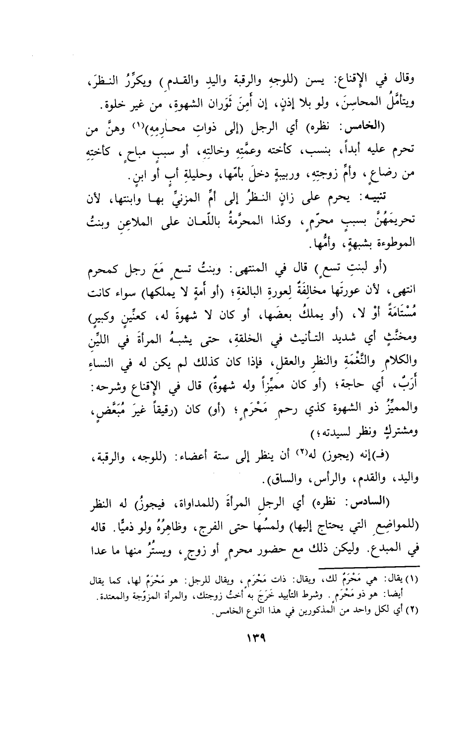 وقال في الإِقناع: يسن (للوجهِ والرقبة واليدِ والقدم) ويكرِّرُ النظرَ، ويتأمَّلُ المحاسِنَ، ولو بلا إذنٍ، إن أَمِنَ ثَوَران الشهوةِ، َ من غير خلوة.