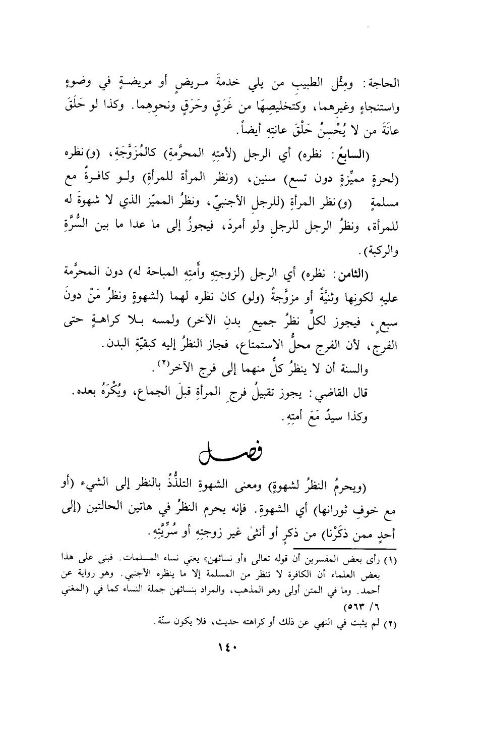 (الثامن: نظره) أي الرجل (لزوجتِهِ وأَمتِهِ المباحة له) دون المحرَّمة عليهِ لكونها وثنيَّةً أو مزوجةً (ولو) كان نظره لهما (لشهوةٍ ونظرُ مَنْ دونَ سبعٍ، فيجوز لكلٍّ نظرُ جميعِ بدنِ الآخر) ولمسه بلا كراهةٍ حتى الفرج، لأن الفرج محلُّ الاستمتاع، فجاز النظرُ إليه كبقيّةِ البدن.
