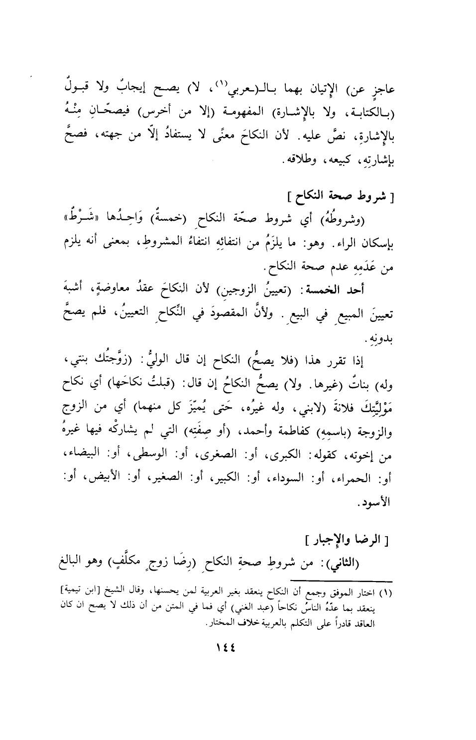 (¬1) اختار الموفق وجمع أن النكاح ينعقد بغير العربية لمن يحسنها، وقال الشيخ [ابن تيمية] ينعقد بما عدّهُ الناسُ نكاحاً (عبد الغني) أي فما في المتن من أن ذلك لا يصبح إن كان العاقد قادراً على التكلم بالعربية خلاف المختار.