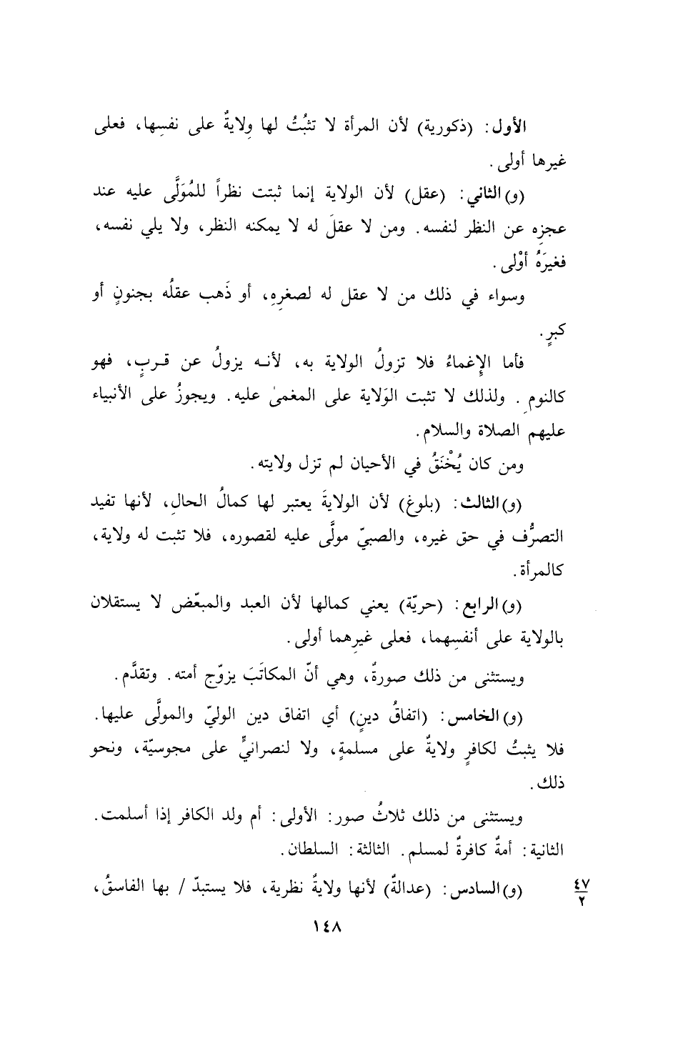 الأول: (ذكورية) لأن المرأة لا تثبُتُ لها وِلايةٌ على نفسِها، فعلى غيرها أولى.