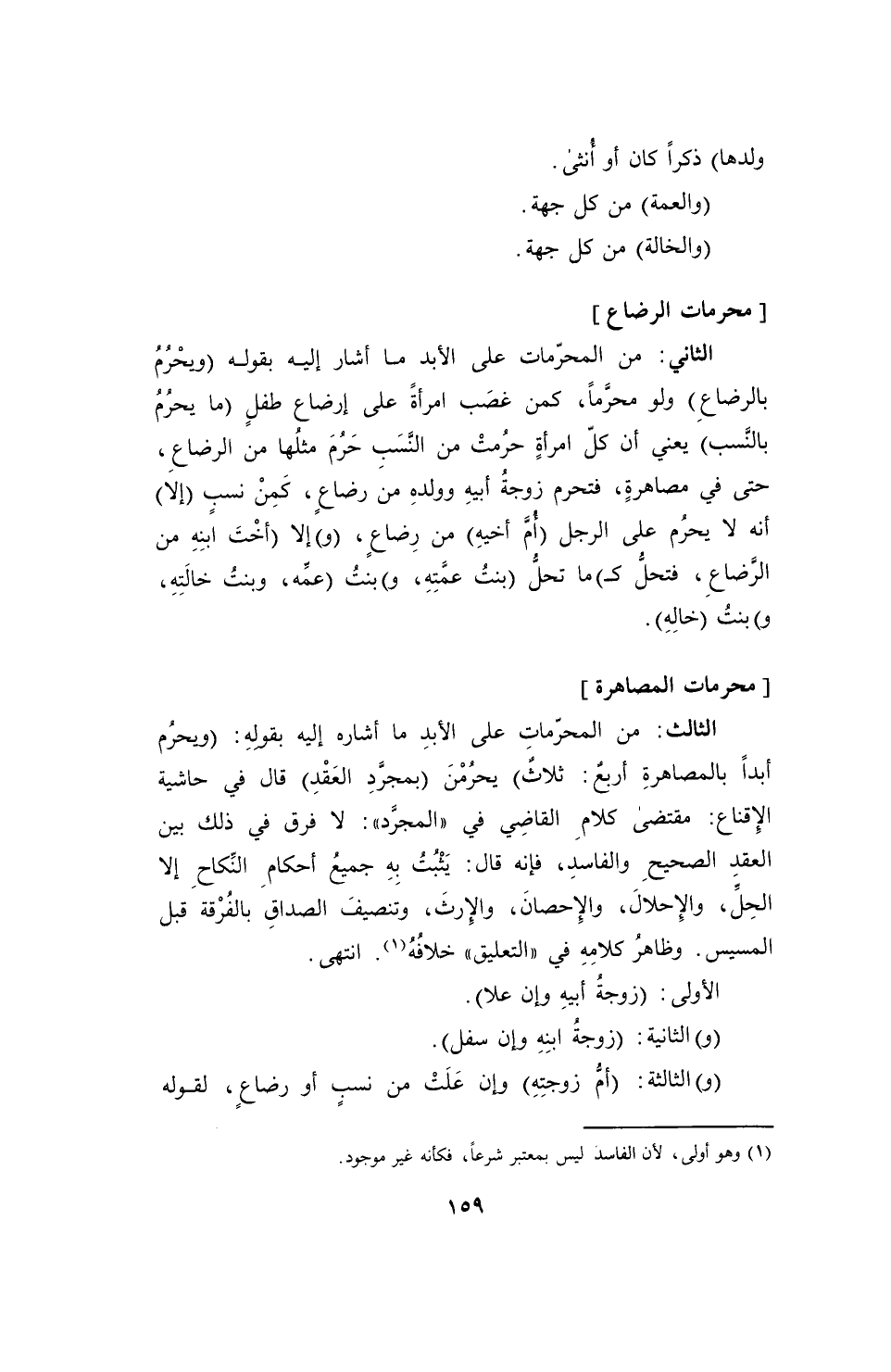الثالث: من المحرّماتِ على الأبدِ ما أشار إليه بقوله: (ويحرُم أبداً بالمصاهرةِ أربعٌ: ثلاثٌ) يحرُمْنَ (بمجرَّدِ العَقْدِ) قال في حاشية الإِقناع: مقتضى كلامِ القاضِي في "المجرَّد": لا فرق في ذلك بين العقدِ الصحيحِ والفاسدِ، فإنه قال: يَثْبُتُ بِهِ جميع أحكامِ النِّكاحِ إلا الحِلِّ، والإحلالَ، والإِحصانَ، والإِرثَ، وتنصيفَ الصداقِ بالفُرْقة قبل المسيس. وظاهرُ كلامِهِ في "التعليق" خلافُهُ (¬1). انتهى.