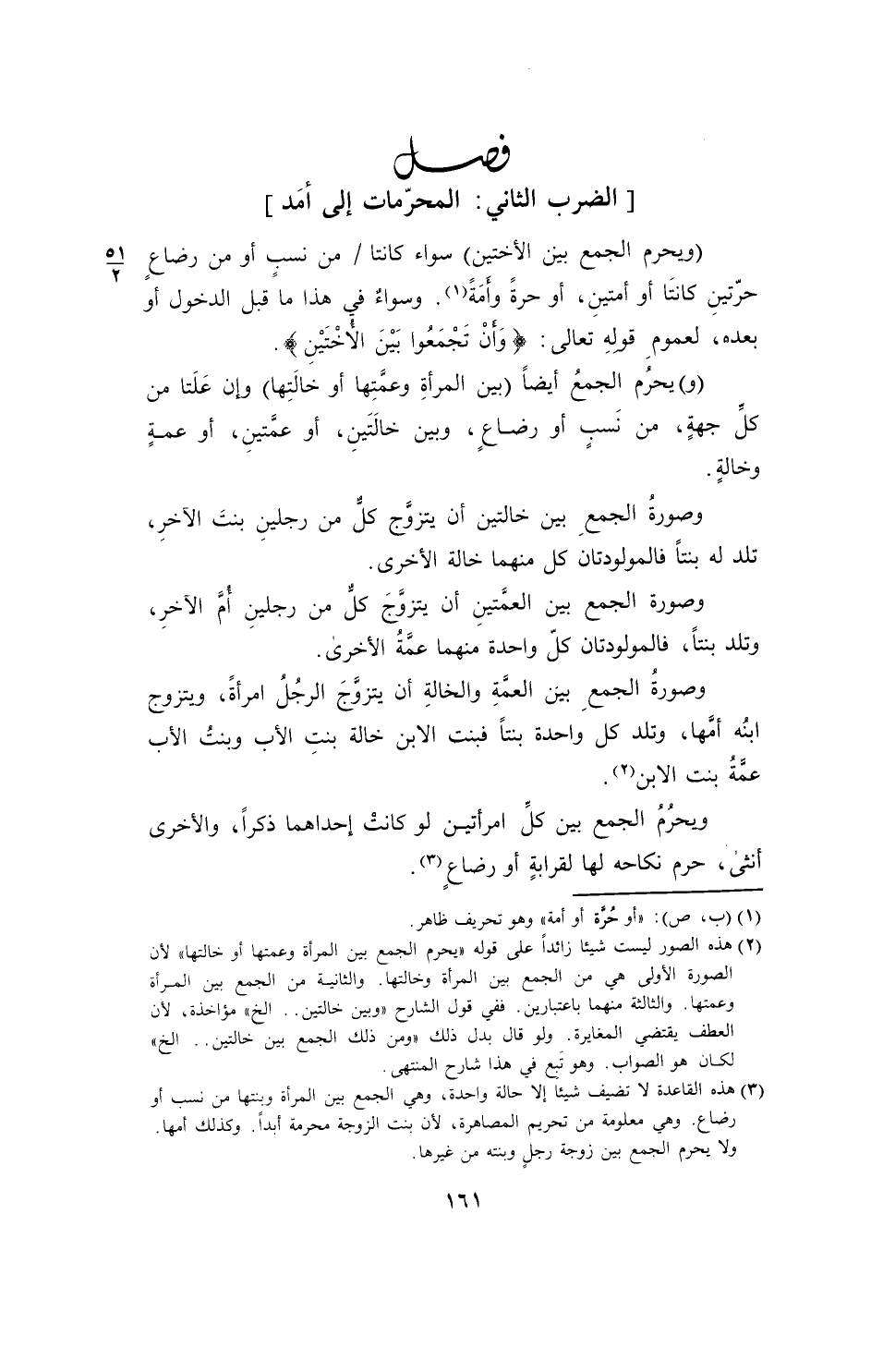 (¬2) هذه الصور ليست شيئاً زائداً على قوله "يحرم الجمع بين المرأة وعمتها أو خالتها" لأن الصورة الأولى هي من الجمع بين المرأة وخالتها. والثانية من الجمع بين المرأة وعمتها. والثالثة منهما باعتبارين. ففي قول الشارح "وبين خالتين .. الخ " مؤاخذة، لأن العطف يقتضي المغايرة. ولو قال بدل ذلك "ومن ذلك الجمع بين خالتين .. الخ" لكان هو الصواب. وهو تَبع في هذا شارح المنتهى.