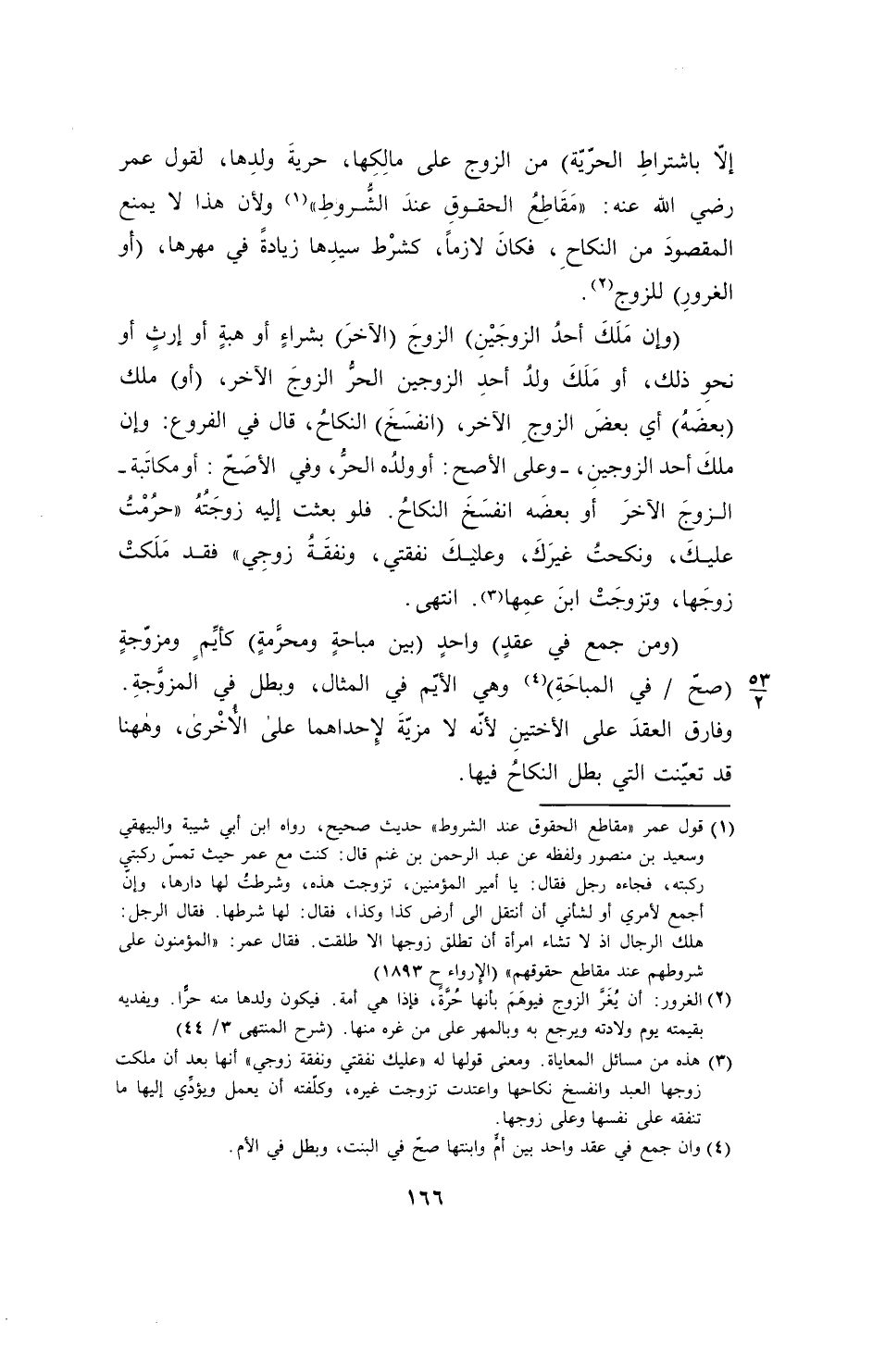 (¬1) قول عمر "مقاطع الحقوق عند الشروط" حديث صحيح، رواه ابن أبي شيبة والبيهقي وسعيد بن منصور ولفظه عن عبد الرحمن بن غنم قال: كنت مع عمر حيث تمسّ ركبتي ركبته، فجاءه رجل فقال: يا أمير المؤمنين، تزوجت هذه، وشرطتُ لها دارها، وإن أجمع لأمري أو لشأني أن أنتقل إلى أرض كذا وكذا، فقال: لها شرطها. فقال الرجل: هلك الرجال إذ لا تشاء امرأة أن تطلق زوجها إلا طلقت. فقال عمر: "المؤمنون على شروطهم عند مقاطع حقوقهم" (الإِرواء حٍ 1893)